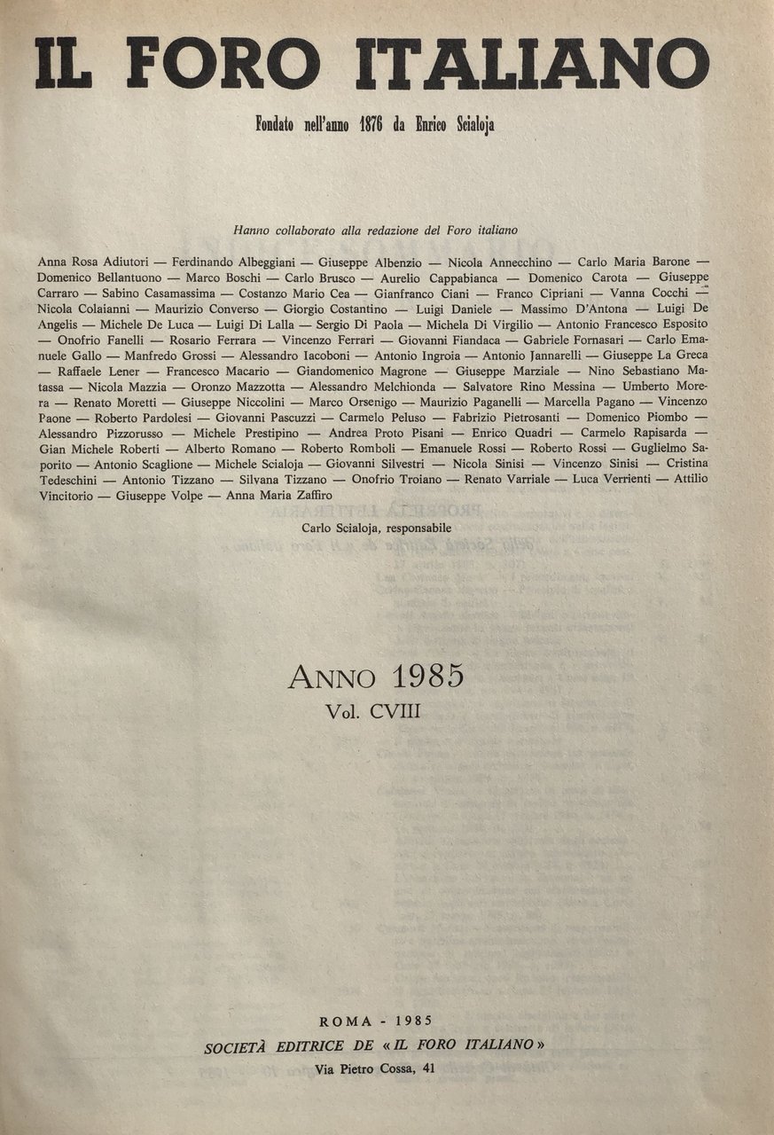 Il Foro Italiano. Fondato nell'anno 1876 da Enrico Scialoja. Anno CVIII. 1985