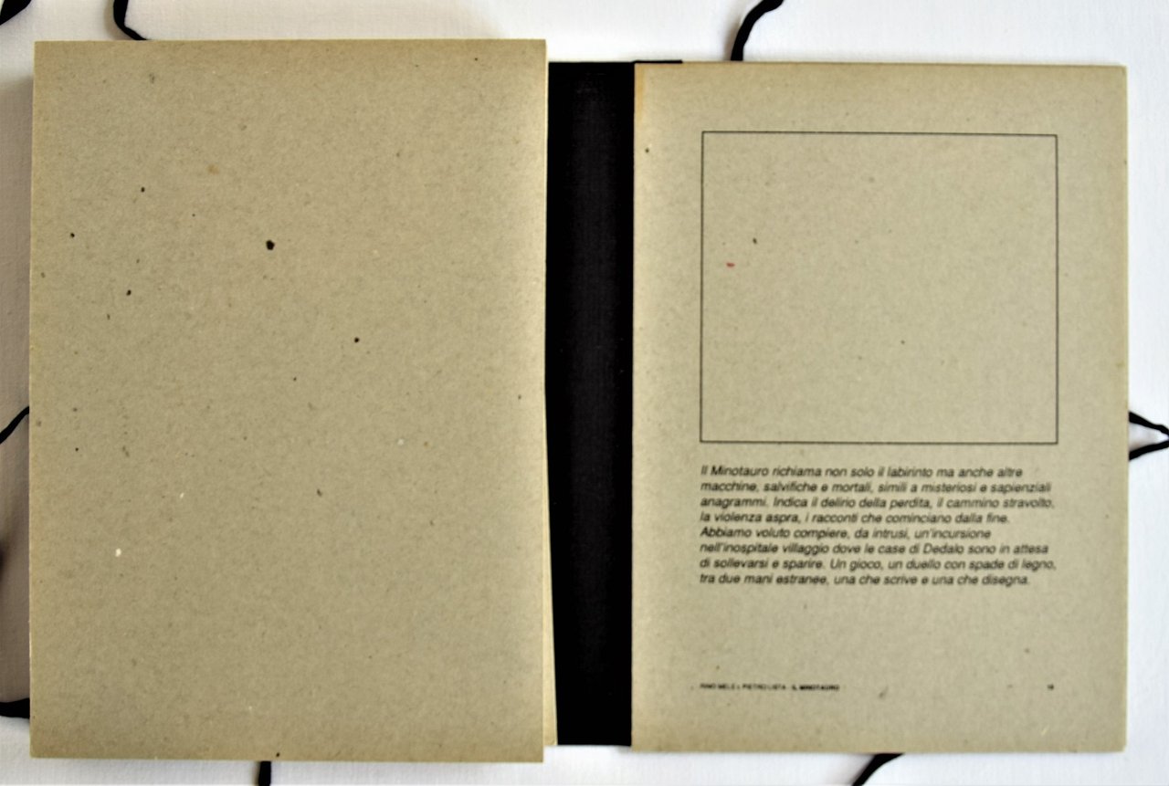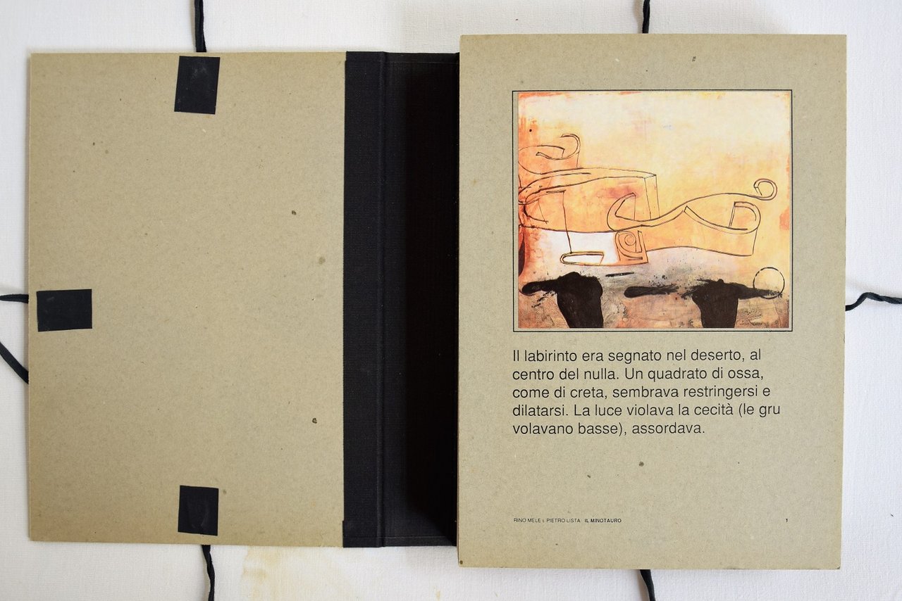 Testo di Rino Mele. 14 tavole a colori con riproduzione di disegni di Pietro Lista applicate su cartoncini sciolti. 2 fotografie in bianco e nero deglia autori di Ugo Marano e Armando Cerzosimo. Biografie . 4to (cm 30x22). pp. 15. . Ottimo (Fine). . Prima edizione di 500 esemplari (First edition of 500 copies). . Il Minotauro richiama non solo il labirinto ma anche altre macchine, salvifiche e mortali, simili a misteriosi e sapienziali anagrammi. Indica il delirio della perdita, il cammino stravolto, la violenza aspra, i racconti che cominciano dalla fine. Abbiamo voluto compiere, da intrusi, un'incursione nell'inospitale villaggio dove le case di Dedalo sono in attesa di sollevarsi e sparire. Un gioco, un duello con spade di legno, tra due mani estranee, una che scrive e una che disegna.