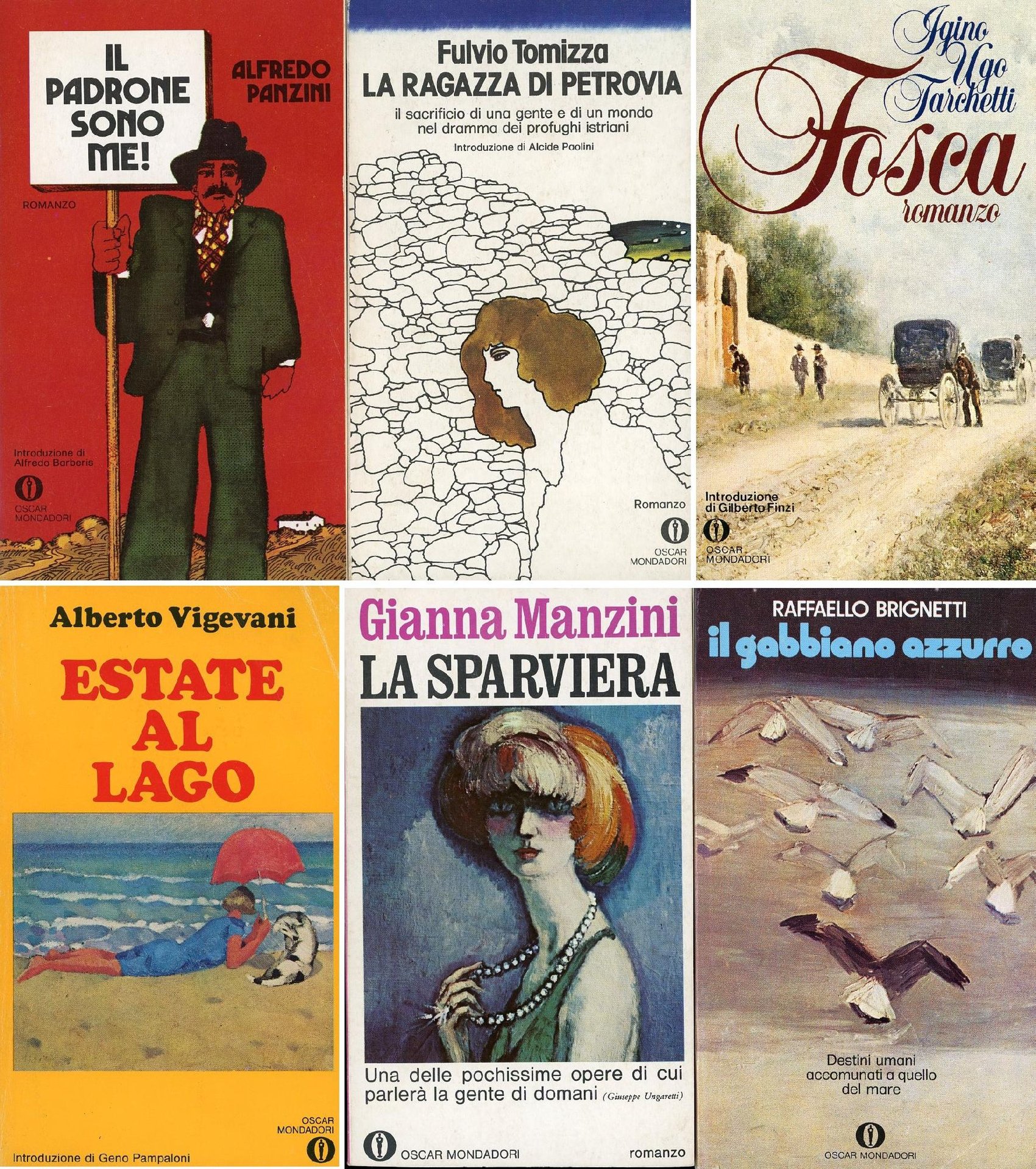 . 16mo. pp. 180. . Molto buono (Very Good). . . . Si aggiungono altri 5 romanzi italiani degli Oscar Mondadori, tutti in ottime condizioni: 1) Fulvio Tomizza, La ragazza di Petrovia,l 1975; 2) Raffaello Brignetti, Il gabbiano azzurro, 1973; 3) Gianna Manzini, La sparviera, 1974; 4) Alberto Vigevani, Estate al lago, 1976; 5) Igino Ugo Tarchetti, Fosca, 1981