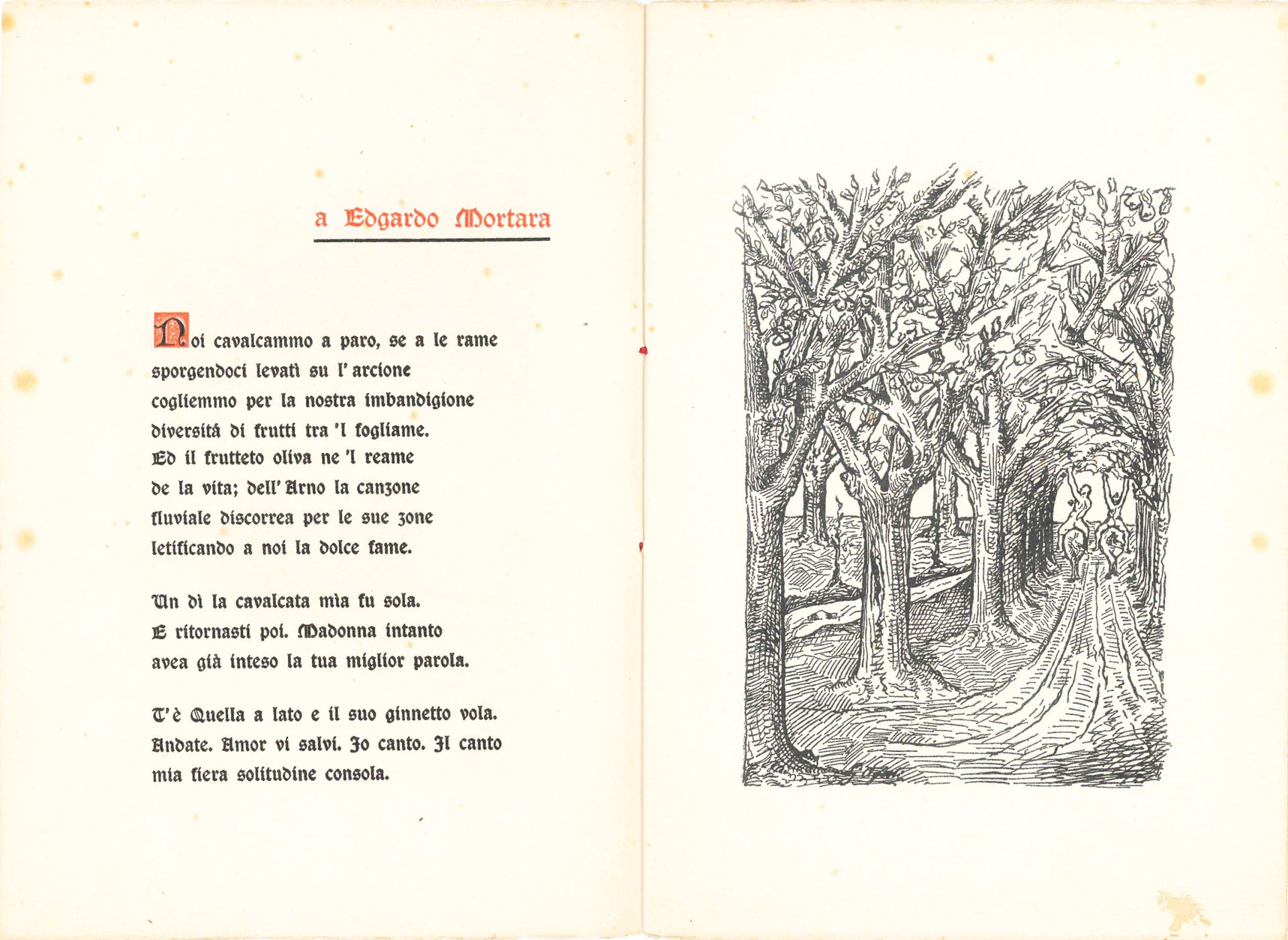 Mm. 240 x 165. Pp. [8]. Brossura coeva (leggermente brunita e con fioriture). Stampato a Firenze su carta di Fabriano. Titolo e testo stampato in rosso e nero in caratteri gotici. Dedica "a Edgardo Mortara", sposo di Gemma Furst in data 2 giugno 1907, come incipit de Il sonetto della Cavalcata. Seguono tre sonetti intitolati Il rinascimento di Fiorenza (I; II; III), con capilettera di colore rosso su sfondo nero. Con quattro illustrazioni a pagina intera, ciascuna per ogni componimento, realizzate da G. Vasori.