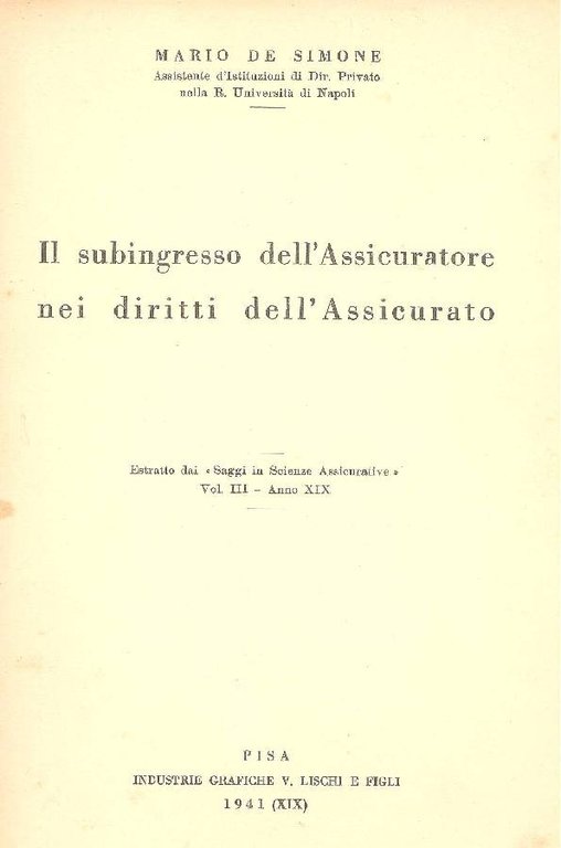 Estratto dai ''Saggi in Scienze Assicurative''. Vol. III - Anno XIX . 8vo. pp. 58. . Molto buono (Very Good). . . .