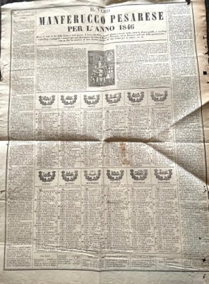 Il vero MANFERUCCO Pesarese per l’anno 1846, dove si vede far la Luna e i suoi quarti, il levar del Sole, mezzo giorno e mezza notte, tutte le Feste mobili, i Novilunj e Plenilunj, i gruppetti e i numeri per ogni Estrazione del Lotto di Roma e Toscana e un Discorso sull’arte della PANIZZAZIONE, con in fine la maniera di fare diverse qualità di VINI ottimi per la salute ec. ec.