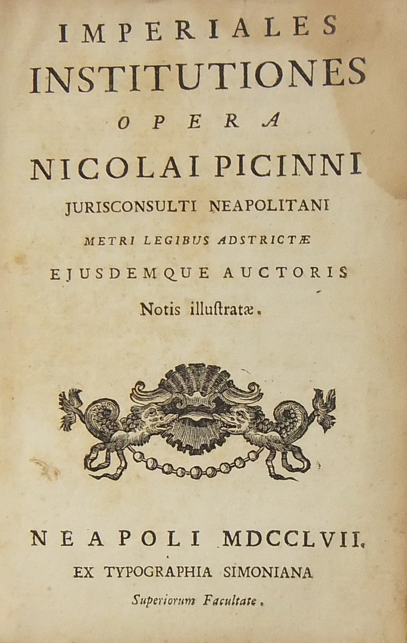 Imperiales Institutiones. metri legibus adstrictae eiusdemque auctoris notis illustratae | Libros antiguos y modernos | Picinni Nicola - Picinni Nicolai