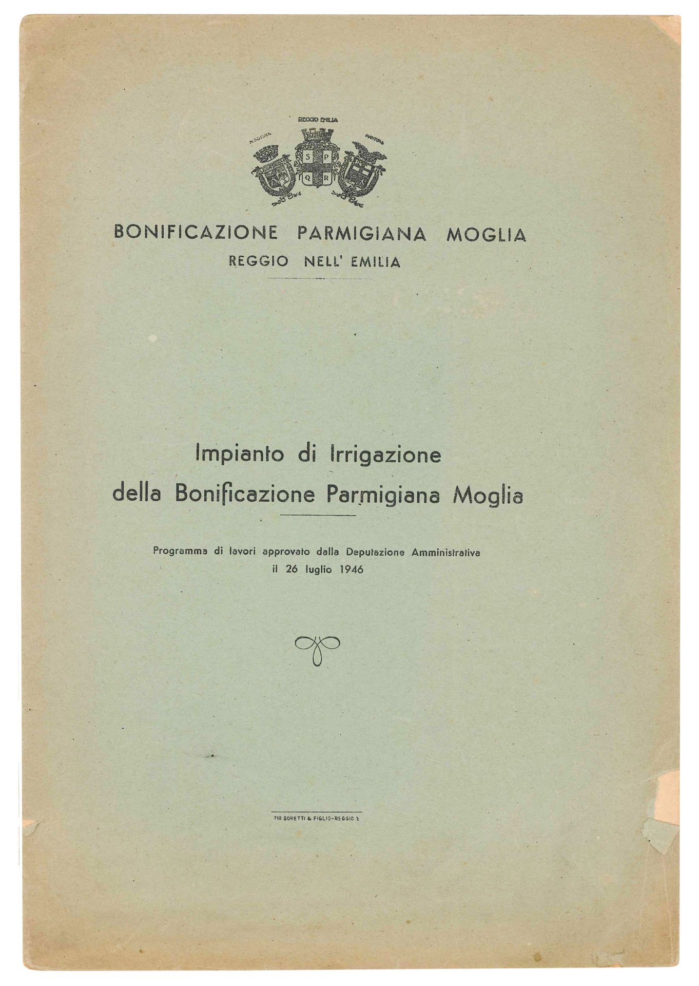 Impianto di Irrigazione della Bonificazione Parmigiana Moglia. Programma di lavori approvato dalla Deputazione Amministrativa il 26 luglio 1946.