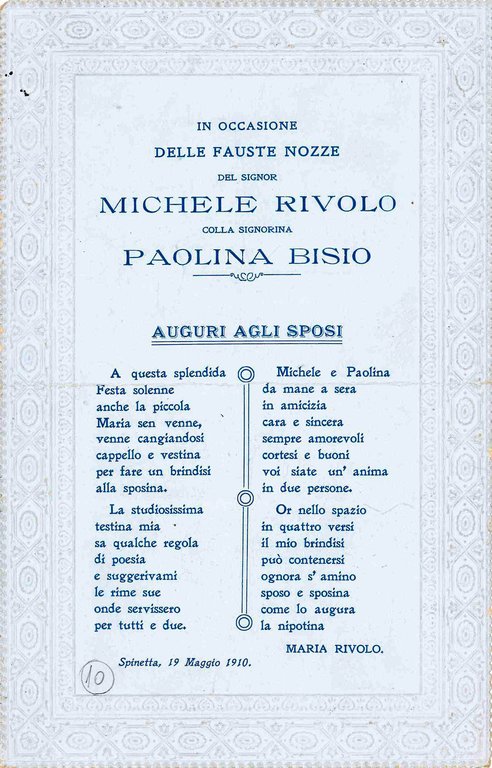 Mm. 210 x 135. Foglio volante in carta azzurra con cornice e fregi dai motivi floreali in rilievo. Poesia dedicata agli sposi Paolina Bisio e Michele Rivolo, dalla di lui nipote Maria Rivolo, per felicitarsi delle nozze celebrate a Spinetta in data 19 maggio 1910.