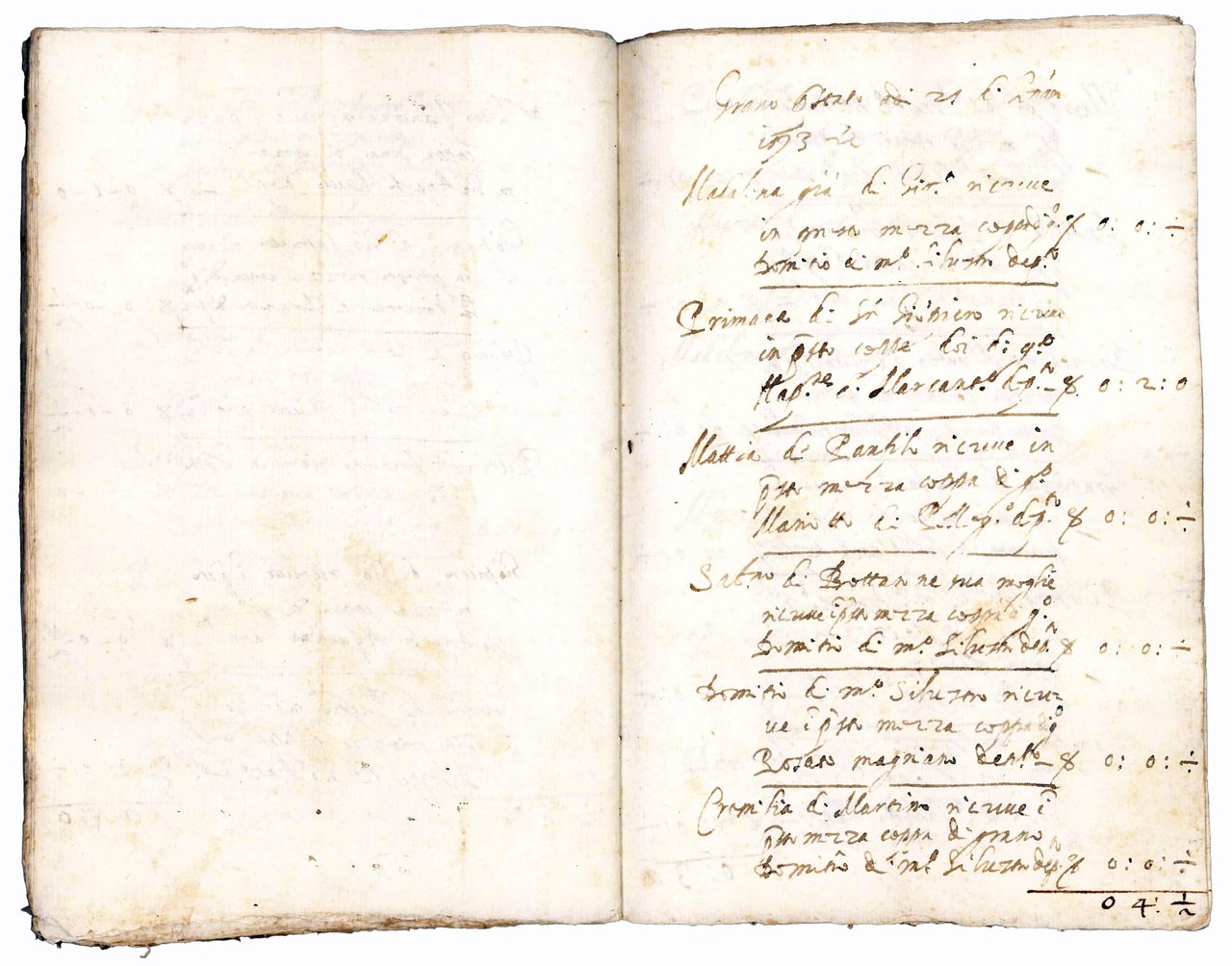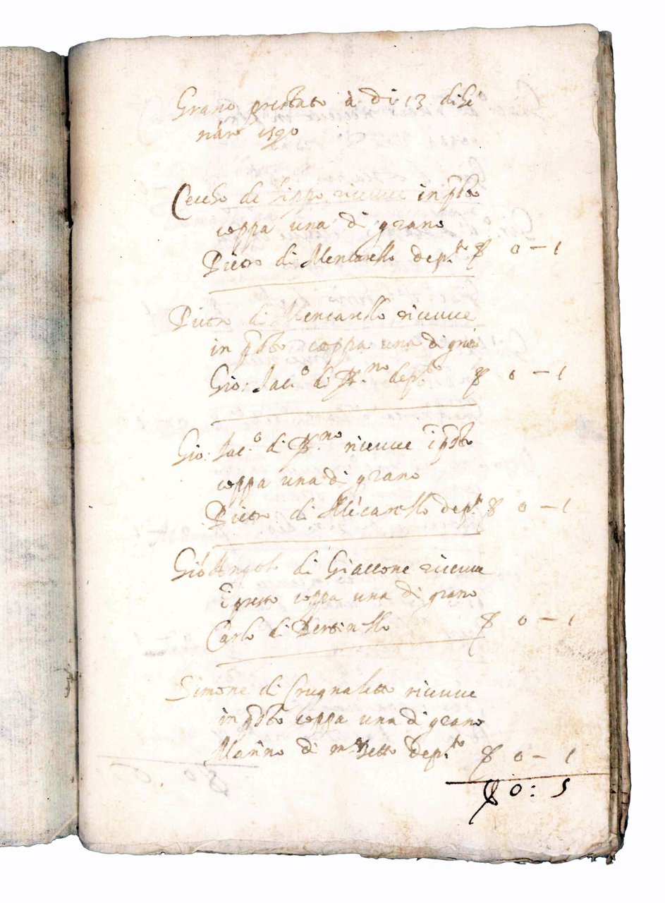 In questo presente libretto io Lod.o Bac.o scriverò il grano prestato sotto di mesi et anni infrascritti et sarà intitulato Giornale del granto prestato. Incipit: "Grano prestato a di 13 di Genaro 1590". Manuscript on paper in Italian, end of the 16th cent.