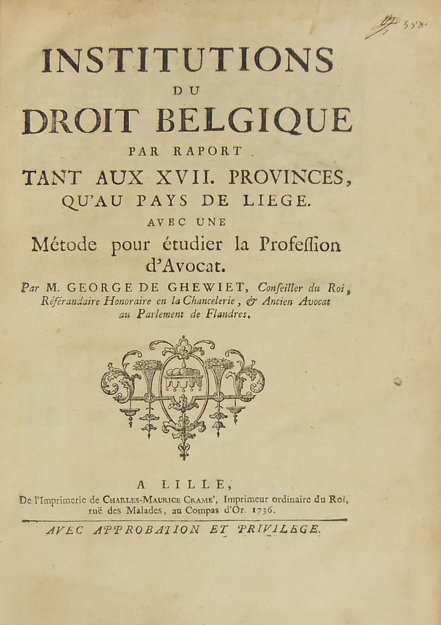 Institutions du droit belgique par raport tant aux XVII provinces qu'au pays de Liege avec une metode pour etudier la profession d'Avocat | Libros antiguos y modernos | De Ghewiet George