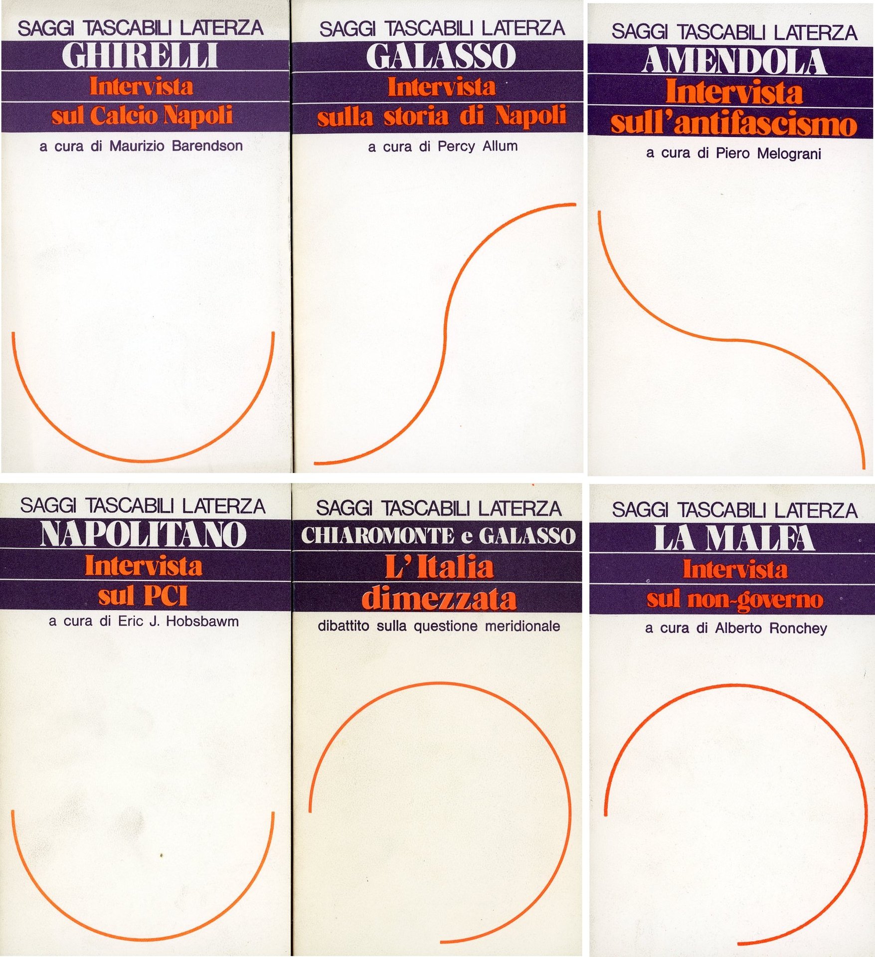 . 16mo. pp. circa 250/vol. . Molto buono (Very Good). . . . Si aggiungono altri 5 volumi sull'argomento dello stesso editore/collana: Giorgio Napolitano, Intervista sul PCI, 1976 - Antonio Ghirelli, Intervista sul calcio a Napoli , 1978 - Giuseppe Galasso, Intervista sulla storia di Napoli, 1978 - Giuseppe Galasso e Gerardo Chiaromonte, L'Italia dimezzata, 1980 - Giorgio La Malfa, Intervista sul non-governo, 1977