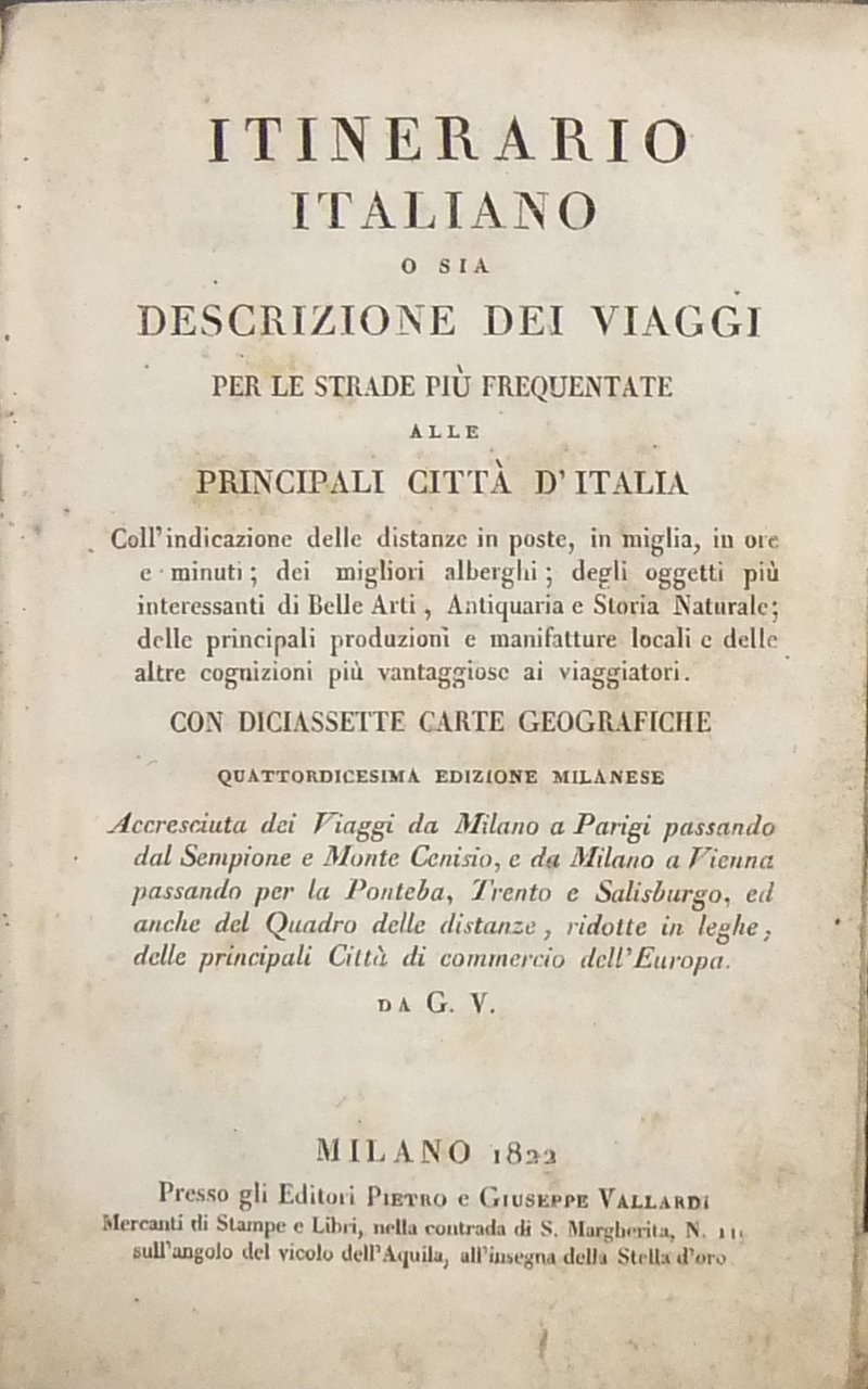 Itinerario italiano o sia descrizione dei viaggi per le strade più frequentate alle principali città d'Italia. Coll'indicazione delle distanze in poste, in miglia, in ore e minuti; dei migliori alberghi; degli oggetti più interessanti di Belle Arti, Antiquaria e Storia Naturale; delle principali produzioni e manifatture locali, e delle altre cognizioni più vantaggiose ai viaggiatori. Con diciassette carte geografiche.
