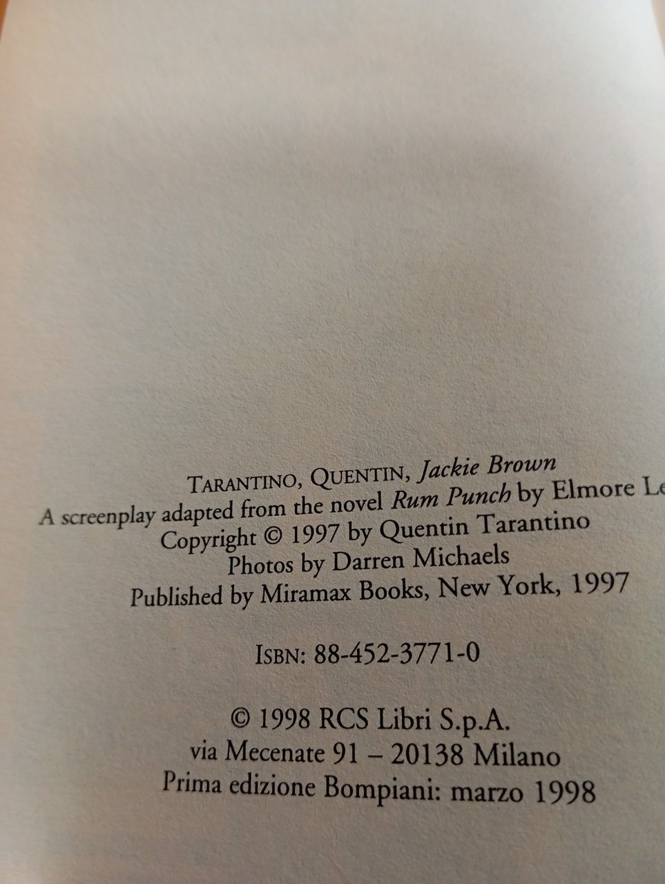 Jackie Brown, la sceneggiatura, Quentin Tarantino, Bompiani, 1998 | Libros antiguos y modernos |