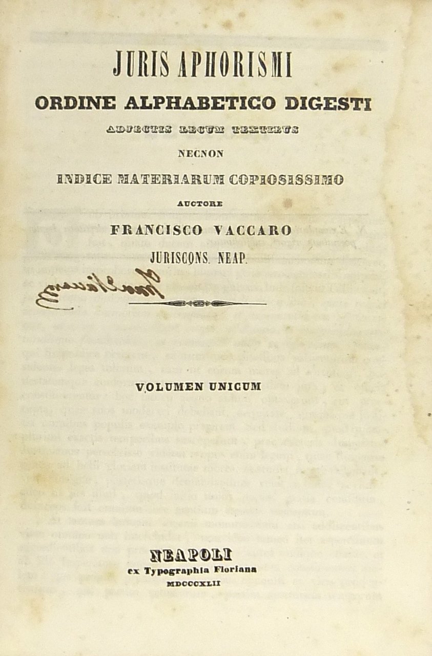 Juris aphorismi. Ordine alphabetico digesti adjectis legum textibus necnon indice materiarum copiosissimo auctore Francisco Vaccaro