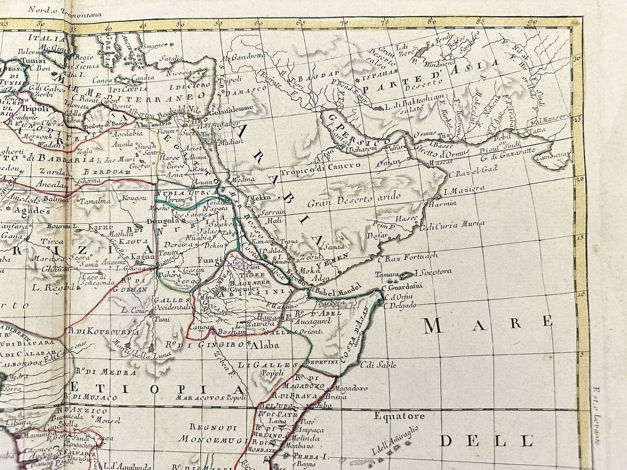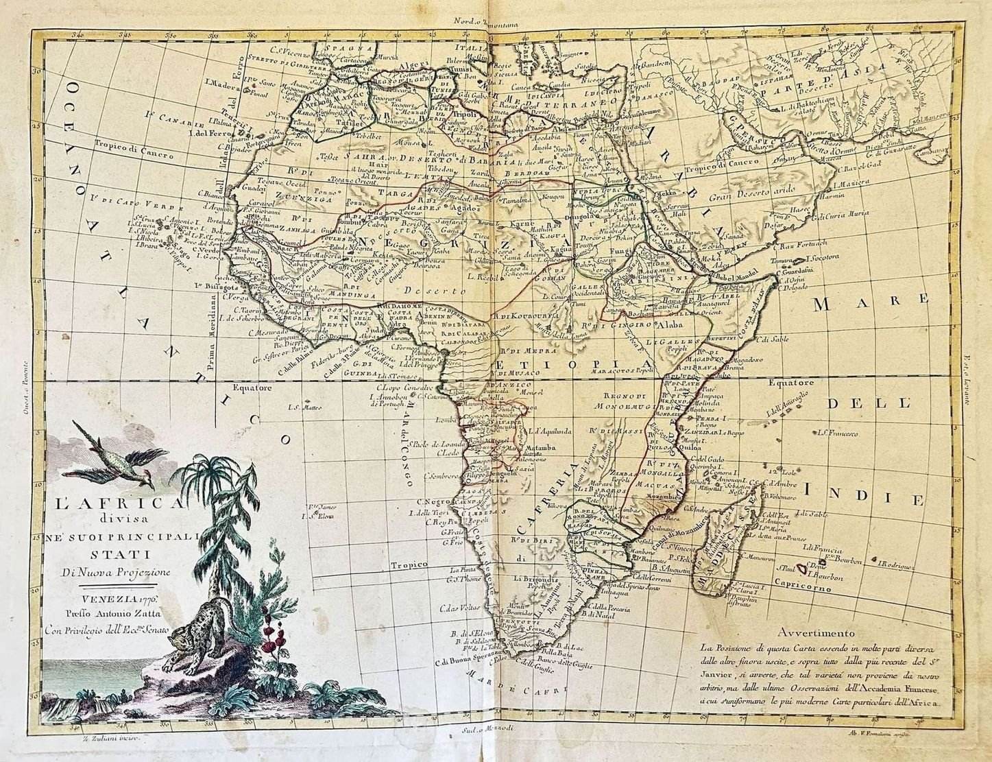 Mappa originale del 1776 che mostra l'Africa stampata dal celebre stampatore veneziano Zatta. Curioso l'avvertimento nell'angolo in basso a destra "La posizione di questa Carta essendo in molte parti diversa dalle altre finora uscite, e sopra tutto dalla più recente del S.r Janvier, si avverte, che tal varietà non proviene da nostro arbitrio, ma dlle ultime Osservazioni dell'Accademia Francese, a cui s'uniformano le più moderne Carte particolari dell'africa". Acquarellatura coeva. Bel cartiglio. Autore: Zuliani Atlante: Atlante Novissimo, Illustrato ed Accresciuto sulle osservazioni, e scoperte fatte dai più celebri e più recenti geografi. Venezia, presso Antonio Zatta. Vol. IV° Data: 1776 Tecnica: Acquaforte Dimensione del foglio: 50x37,5 cm Dimensione incisione: 41,5x31,5 cm Condizioni: Buone. Alcune fioritureSegno di gora d'acqua ai margini destro e sinistro. alcune macchiette. Piega centrale editoriale. Piccolo strappo verticale di cm 4 al margine inferiore riparato Original map of 1776 featuring Africa edited by the prestigious italian editor Zatta from Venice. Curious communication in the lower right corner: "La posizione di questa Carta essendo in molte parti diversa dalle altre finora uscite, e sopra tutto dalla più recente del S.r Janvier, si avverte, che tal varietà non proviene da nostro arbitrio, ma dalle ultime Osservazioni dell'Accademia Francese, a cui s'uniformano le più moderne Carte particolari dell'africa": “This map of Africa is different from the others, above all from the most recent of Janvier. These differences come from the last Observations of French Academy which gives directions for the modern maps.” Nice coeval colouring. Nice cartridge. Author: Zuliani Atlas: Atlante Novissimo, Illustrato ed Accresciuto sulle osservazioni, e scoperte fatte dai più celebri e più recenti geografi. Venezia, presso Antonio Zatta. Vol. IV° Date: 1776 Technique: copper engraving Leaf Dimension: 50x37,5 cm (19.7x14.8 inches) Engraving Dimension: 41,5x31,5 cm (16.3x12.4 inches) Conditions: Good conditions. Water stains in the right and left edge, some stains. Little vertical tear of cm 4 in the foot edge which has been repaired.