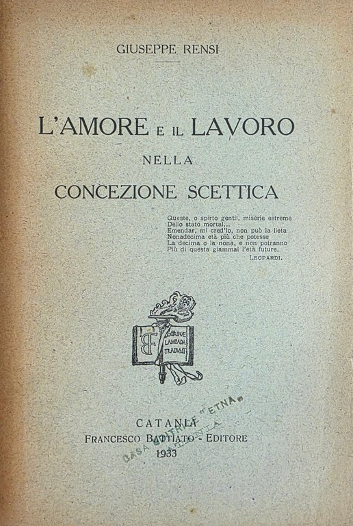 L' AMORE E IL LAVORO NELLA CONCEZIONE SCETTICA | Libros antiguos y modernos | RENSI GIUSEPPE, ,RENSI GIUSEPPE