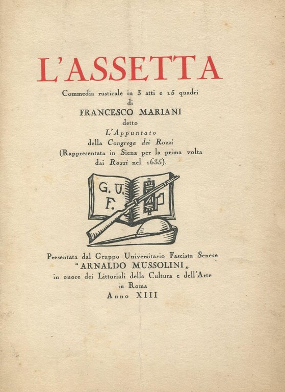 L'Assetta. Commedia rusticale in 3 atti e 15 quadri di Francesco Mariani, detto L'Appuntato, della Congrega dei Rozzi (Rappresentata in Siena per la prima volta dai Rozzi nel 1635) | Libros antiguos y modernos | MARIANI, Francesco