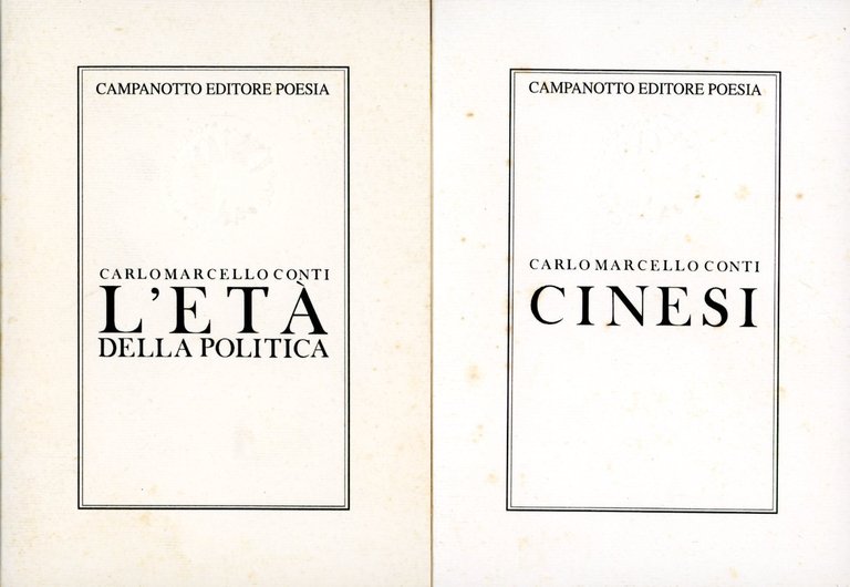 . 16mo. pp. 124. . Ottimo (Fine). . Prima edizione (First Edition). . Si aggiunge un secondo liro dell'Autore: CONTI, Carlo Marcello. Cinesi. Campanotto, 2004