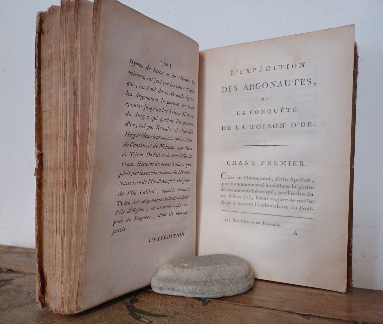 Volume in 8 legatura coeva in mezza pelle, titolo al tassello al dorso, sguardie, occhiello, frontespizio, (56), 400 pp. La prima, preziosa traduzione francese del bellissimo e virulento racconto della spedizione degli Argonauti e della conquista del favoloso Vello d'Oro. Il gigantesco e corrusco quadro riportato con efficacia e s'oserebbe dire con ottima resa delle profonde, occulte e pesanti sensazioni con cui Apollonio di Rodi aveva tessuto la leggenda. Estremamente interessante, in ottimo stato, poco comune.