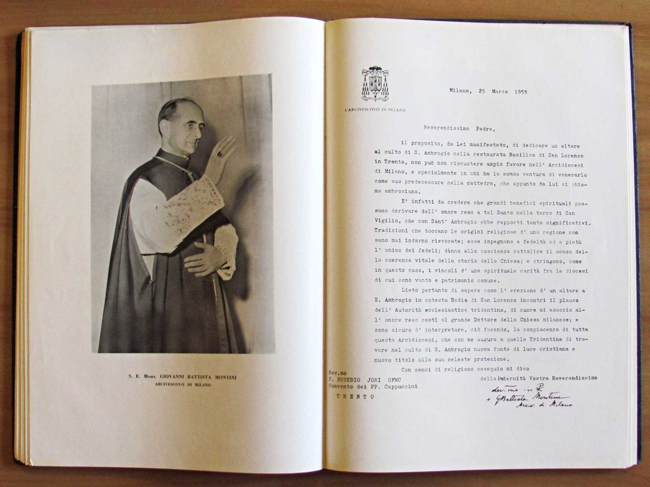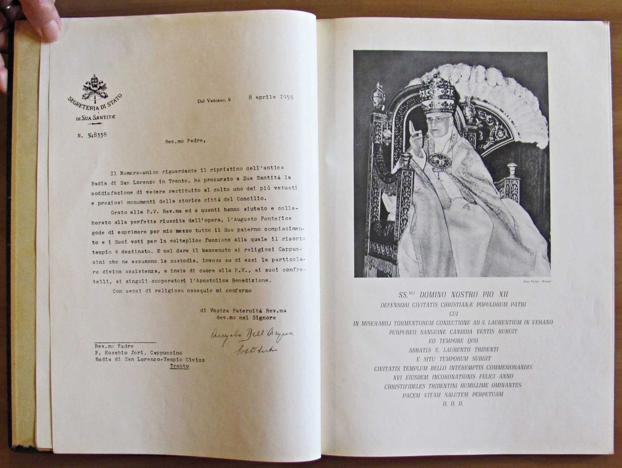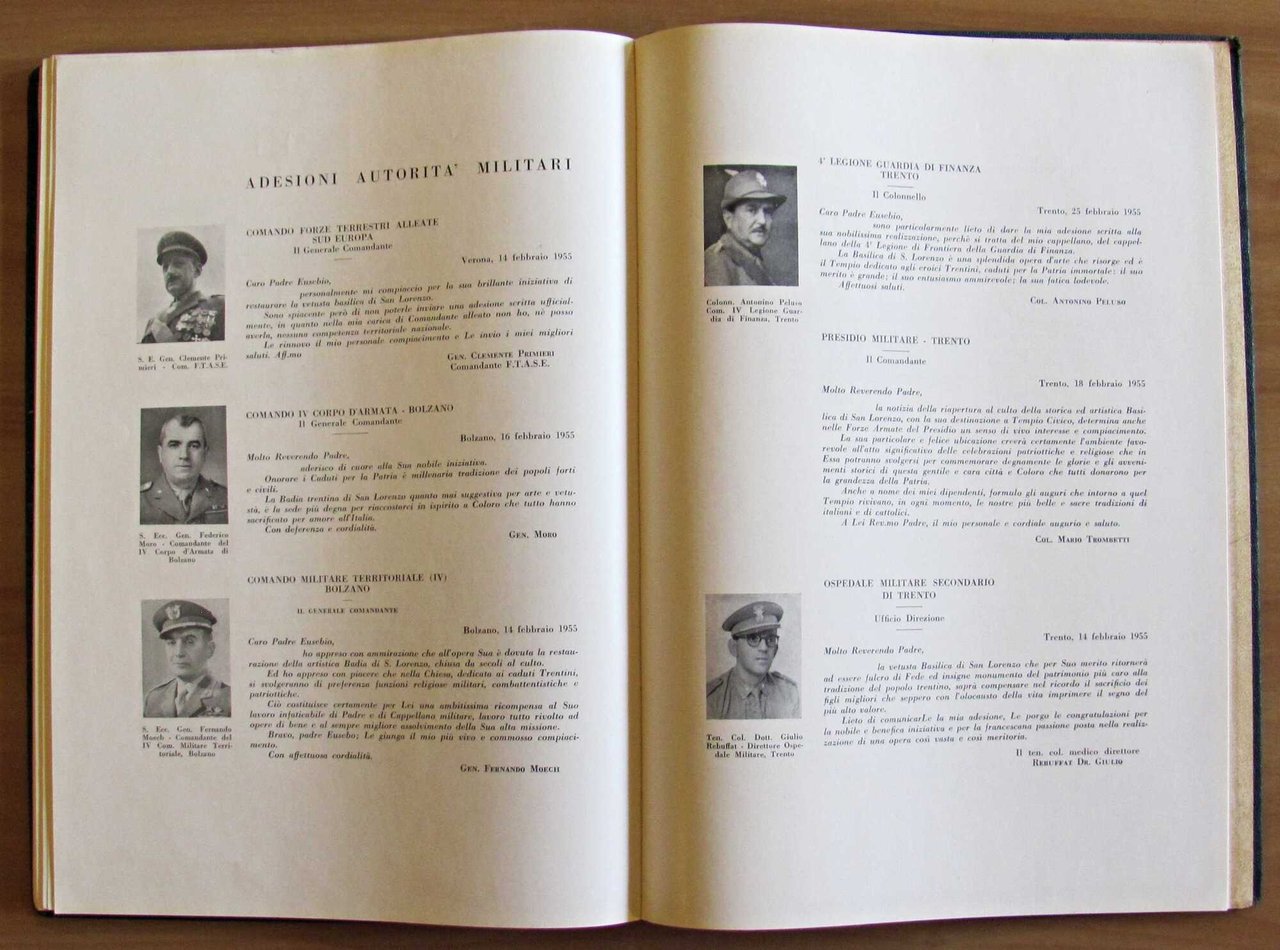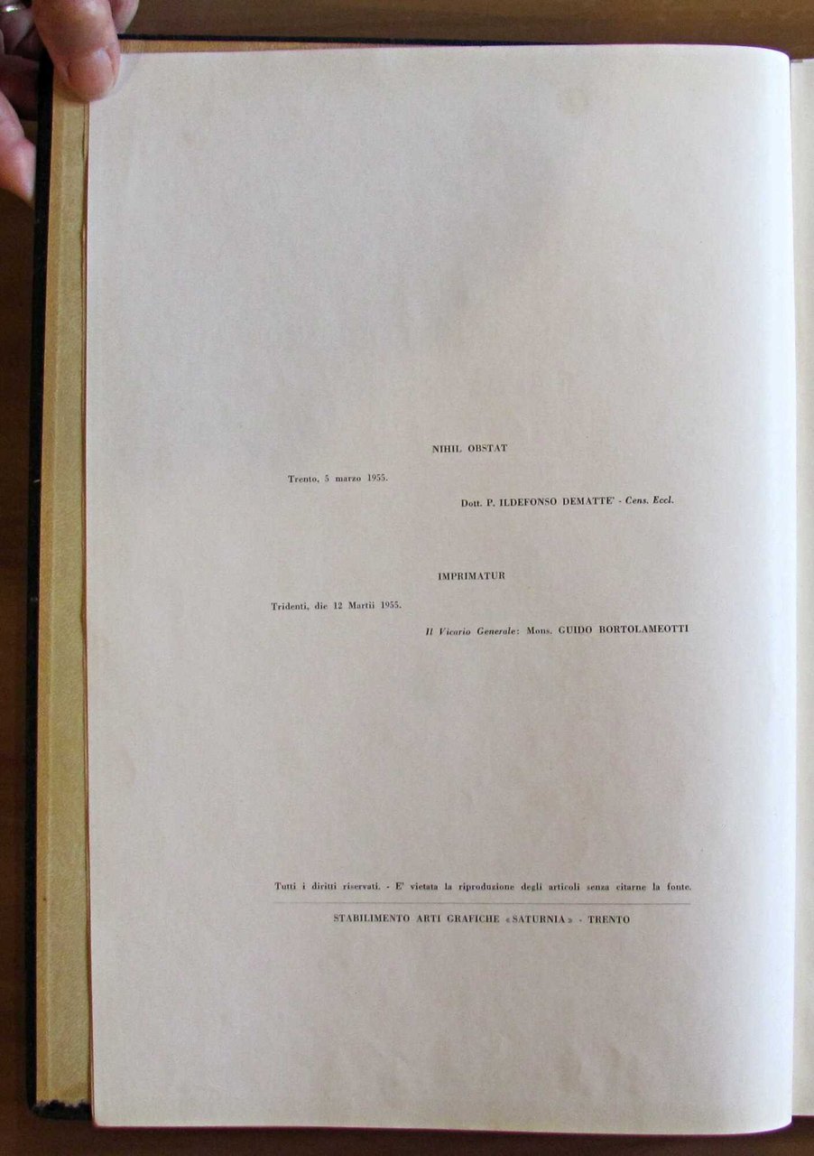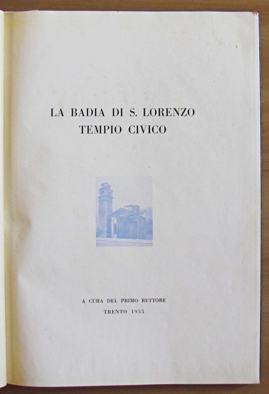 A cura del Primo Rettore Rev.mo Padre Eusebio Jori, Cappuccino. La Badia di S. Lorenzo. Tempio Civico. Piante, prospetti, sezioni e molte illustrazioni fotografiche in b/n n.t. Stabilimento Arti Grafiche "Saturnia" - Trento, 1955. Tela editoriale con illustrazione e titoli in oro al piatto. 24x34; pp.130. Ottimo stato. , Ottimo (Fine)