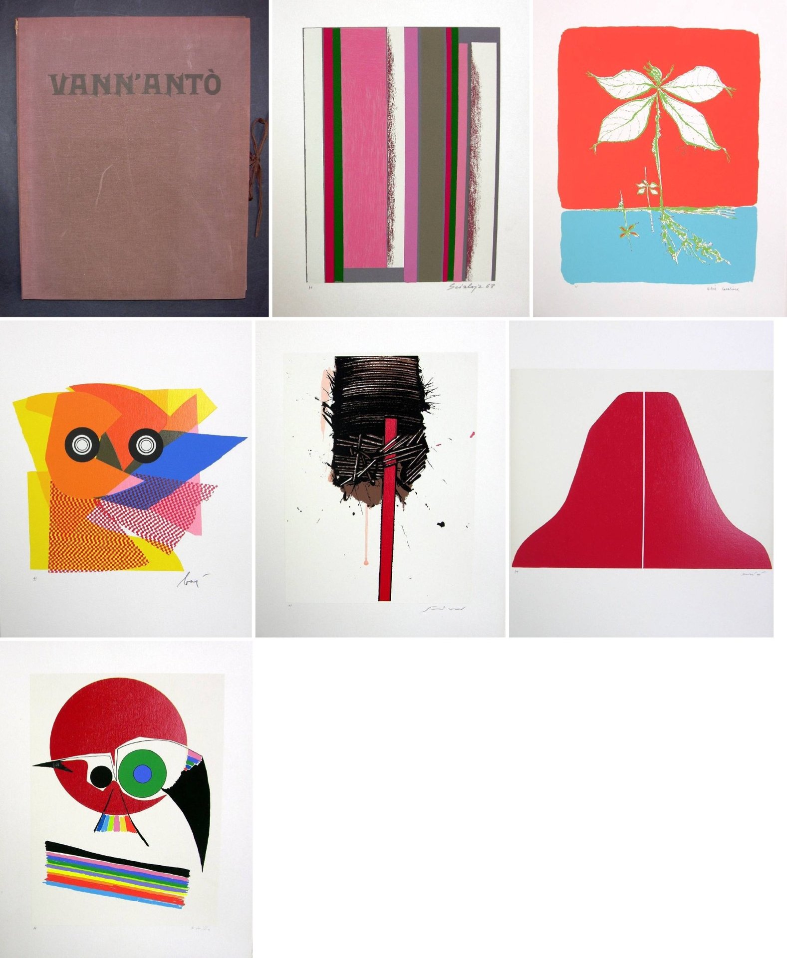 Sette poesie di Vann'Antò e 7 serigrafie originali di Alik Cavaliere, Enrico Baj, Emilio Scanavino, Rodolfo Aricò, Roberto Crippa, Toti Scialoja, Gianni Dova firmate a matita dagli artisti (cm 44x35). Introduzione di Guido Ballo Serigrafie tirate su carta a mano della Cartiera Miliani di Fabriano da Piergiorgio Spallacci. Edizione impaginata da Walter Valentini ed impressa con i tipi delle grafiche A. Nava in Milano. Esemplare H ad personam, firmato da Guido Ballo al colophon. cm 44x35. pp. 40+incisioni. . Molto buono (Very Good). . Edizione originale di 90+XXV+10 es. numerati. .