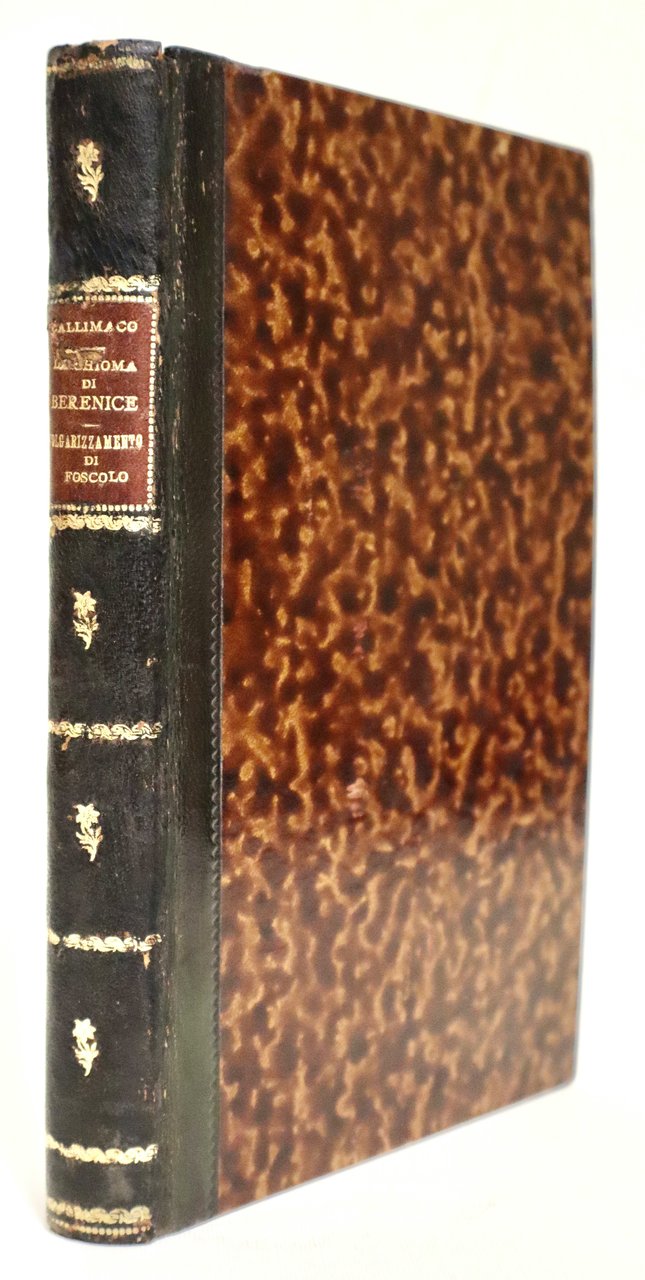 In 8° (mm 215x146); pagg. (10), 9-228; legatura ottocentesca in mezza pelle (leggermente posteriore), titolo e autore in oro su tassello granata al dorso, arricchito da piccoli fregi in oro. Rara prima edizione in prima tiratura, prima delle modifiche di testo a pagina 225. Foscolo, accortosi di alcuni errori, apportò delle modifiche sulle copie invendute (circa 400). Nella prima tiratura si legge a pag. 225 "… e sulle Sirene incantate da Ulisse perch'ei gettò nel mare i proprj genitali" mentre nella seconda "… e sopra Arione che scongiurava i diavoli in corpo alle cavalle come un dì facea il figliuolo d'Isai co' diavoli del suo re". A causa dell'allungamento del testo nella pagina 226 nella seconda tiratura ci sono sei righe rispetto alle cinque originarie. Piccolo difetto reintegrato al dorso, traccia di una piega verticale ad alcune pagine ma per il resto ottimo esemplare assai fresco. Ottolini 104, Acchiappati 34. <BR>