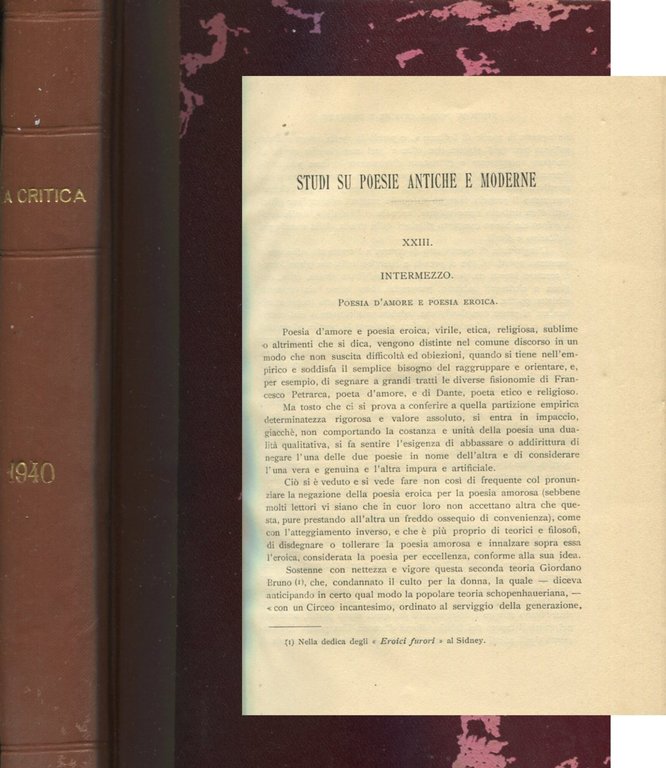 Contenuti: Studi su poesie antiche e moderne (Foscolo. Intorno alle Grazie - Omero, interpretazione moderna di taluni giudizi antichi - Catullo: Carme LXXVI - Marziale: l'epistola a Basso - Diderot. Jacques le fataliste: Histoire de M.me de la Pommeraye et du marquis des Arcis - Burns. Tre canti - Ronsard. Tre sonetti e un'ode) - Paralipomeni del libro sulla storia - Il concetto filosofico della storia della filosofia - Suggestioni dell'Estetica per riforme in altre parti della filosofia - Giudizio storico e azione morale - Intorno all'estetica del Dewey (Benedetto Croce) - Note critiche alla storia del Risorgimento - La cultura francese nell'età della Restaurazione (Adolfo Amodeo) - Rivista bibliografica - Varietà (La croce d'Ercolano e il culto precostantiniano della croce - il "Beneficio di Cristo" - L'architettura e il barocco - Di Giovita Scalvini, dei suoi manoscritti inediti e dei sui giudizi sul Goethe - A proposito della nuova edizione della "Storia dei Musulmani di Sicilia" di Michele Amari) - Aneddoti di storia civile e letteraria (Una lettera inedita dell'Engels intorno a Giovanni Bovio - Di un cantastorie del Cinquecento e di un luogo delle Memorie del Casanova - Joseph Chalier a Napoli nel 1790 - Il Manzoni e i Longobardi - Comici spagnuoli in Italia nel Seicento - Intorno a un'ode del Saint-Evremond) - Notizie ed osservazioni (Fenomenismo estetico e infinità dell'opera d'arte - Filosofia politicante - Vaniloqui filosofici sullo Stato - L'Albania e un preteso principe Skanderberg - Il Manzoni e il gesuita padre Manera - Dio e la solitudine - La filosofia e i gatti del Dalbono - Il pestifero Gante) - Postille (Scalata di poetastri e scrittorelli alle classi ginnasiali italiane - Cura, Sorge, preoccupazione - Problemi della critica delle arti figurative). Redattore responsabile: Francesco Flora Annata completa composta da 6 fascicoli in un unico volume. 8vo. pp. 392. . Molto buono (Very Good). Copertina con abrasioni (Slight abrasions to front cover). . .