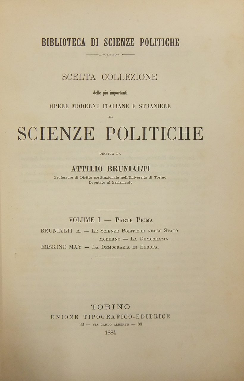 La democrazia in Europa. Con introduzione di Attilio Brunialti: “Le scienze politiche nello Stato moderno. La democrazia” | Libros antiguos y modernos | Erskine May Thomas