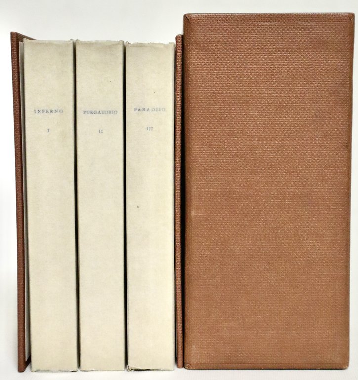 3 voll. in 24° (mm 140x82), pp. 225, (2); 228, (1), (6 bianche); 225, (7). Cartoncino a stampa originale con velina su ogni volume, custodia in cartone rigido con tela nocciola, titolo al dorso in nero, cofanetto di custodia abbinato con la stessa tela. Al colophon "Tiratura di 350 esemplari su carta Montval ".<BR>Rara edizione di piccolo formato della "Commedia", impressa da Tallone quando egli era ancora attivo nel parigino Hotel de Sagonne, il cosiddetto "Dantino", fra le più squisite realizzazioni tipografiche del grande stampatore, che si ispirò qui al formato delle edizioni aldine del 1502 e del 1515, sostituendo il corsivo col carattere tondo corpo 9 ed eliminando il sunto della terza rima attribuito al Boccaccio. <BR>Era il volume prediletto da Tallone che lo chiamava "il Dantino" e lo aveva esposto a Parigi, a Londra, a Parma e a Madrid. E' una deliziosa edizione dantesca, di purezza e semplicita' squisitamente talloniane. La cura testuale è di Francesco Flora, che si fondò sulle lezioni già fissate dal Vandelli, dal Casella e dal Guerri. Al colophon del terzo volume si legge: "Finito di stampare il XX novembre MCMLI nella Tipografia di A. Tallone - Parigi". L'Inferno porta la data del 1950, le altre due cantiche del 1951. Bellissimo esemplare in barbe. Pellizzari, LVI. Italiano.