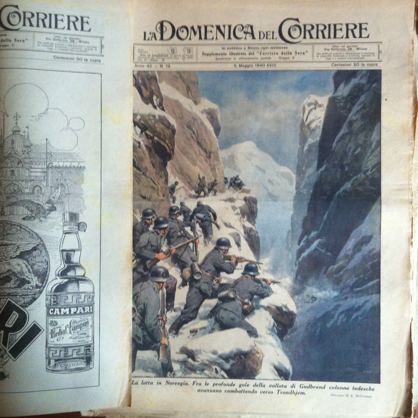 La Domenica del CorriereAll'interno disegno di A. Beltrame: La lotta in Norvegia Gola di Gudbrand verso TrondhjemAeroplani germanici distruggono i nodi ferroviari norvegesiIn buono stato (50 g)E7236