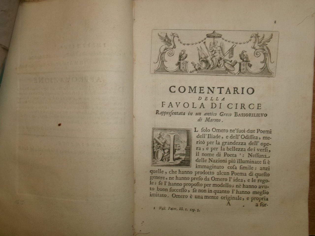 Venuti, Ridolfino. Roma, a spese di Fausto Amidei, nella stamperia de' Bernabò, e Lazzarini, 1758. La favola di Circe rappresentata in un antico greco bassorilievo di marmo commentata... e dedicata al marchese Giuseppe Rondinini patrizio romano possessore del marmo. In-4°, br., cop. muta. (12), 55 pp. con testata e grande iniziale incise in rame. Forellini di tarlo nel margine inferiore interno, peraltro ben conservato. Opuscolo raro. Manca al Rossetti (Rome, a bibliography). Neg. Mob. 2