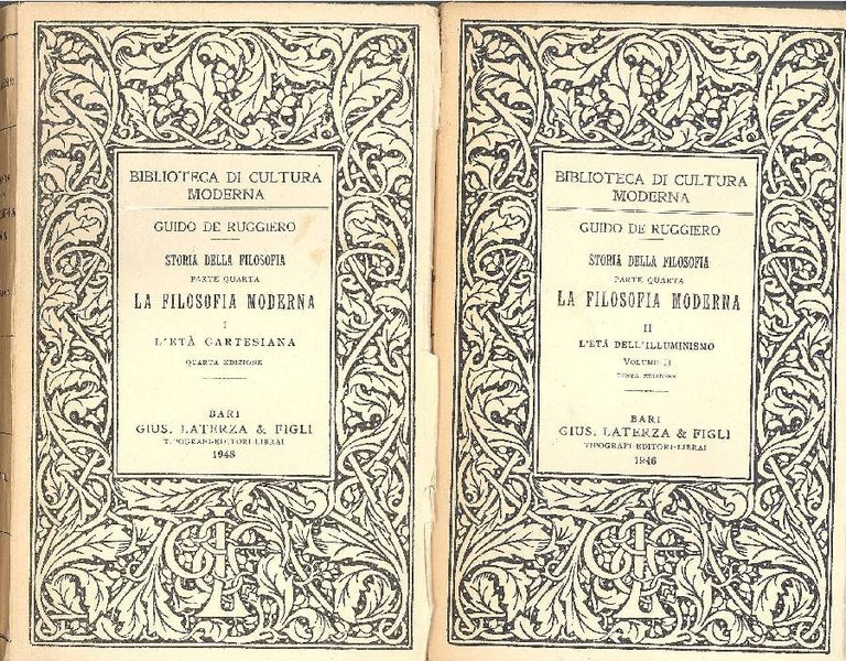 2 volumi in tre tomi - Vol. I: L'età cartesiana (La nuova scienza, Descartes, Spinoza, Cartesianesimo e anticartesianesimo nel Seicento) - Vol. II, Tomo I: (Hobbes e la scuola di Cambridge, Locke e Newton, I moralisti inglesi del '700, Da Berkeley a Hume) - Vol. II, Tomo II: (Leibniz, Voltaire e l'illuminismo francese, Materialismo e sensismo, L'Enciclopedia e gli enciclopedisti, Rousseau). In appendice nota bibliografica e indice dei nomi. Volumi appartenenti a diverse edizioni, pubblicate tra il 1946 e il 1948 . 8vo. pp. 364, 362, 320. . Molto buono (Very Good). Firma di appartenenza alla prima pagina bianca (Owner's name on the first blank page). Quarta edizione (vol. I) - Terza edizione (vol. II. .