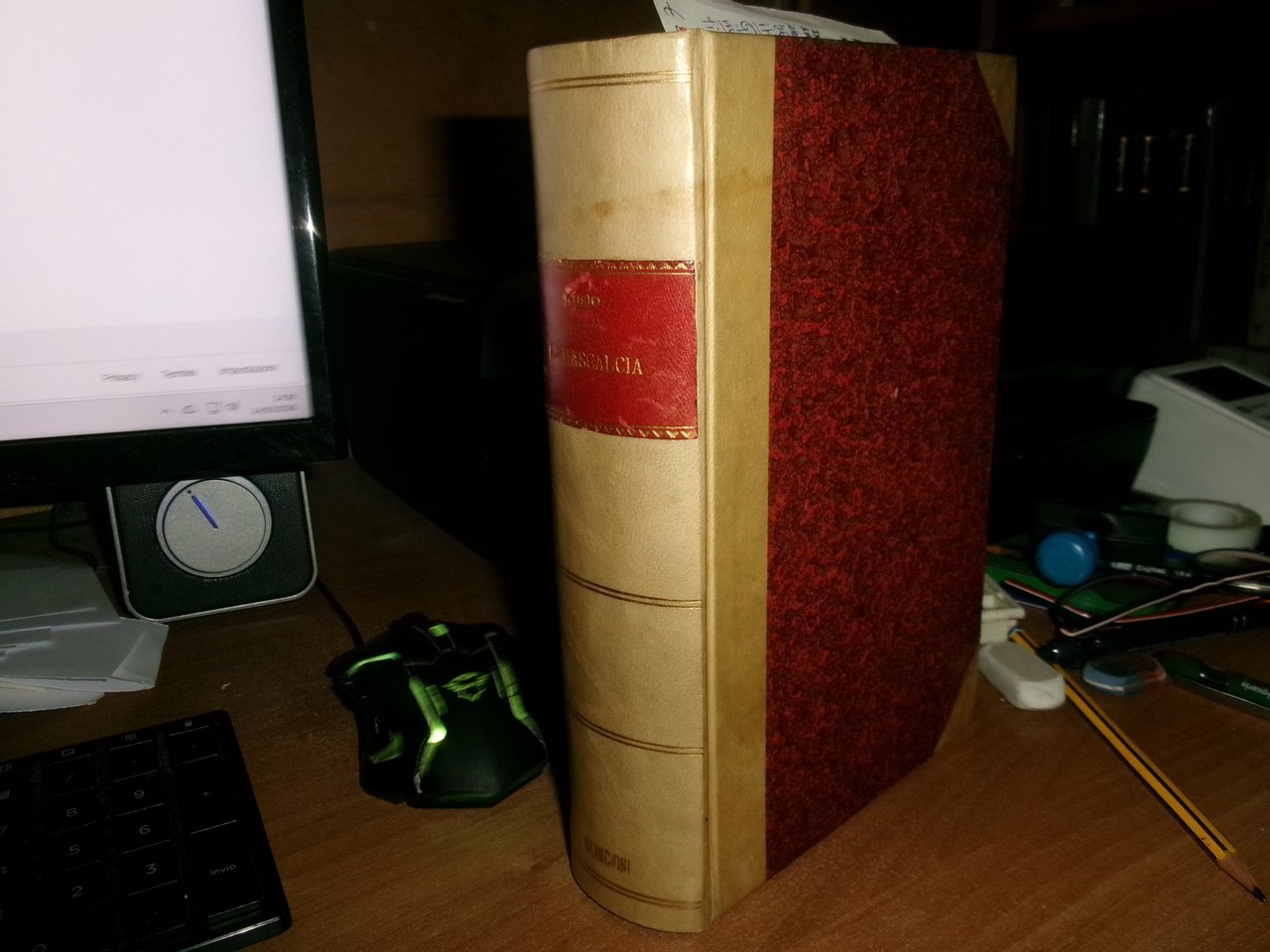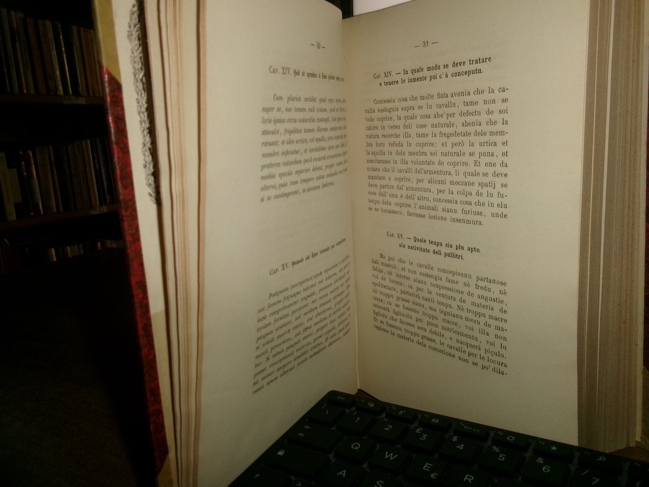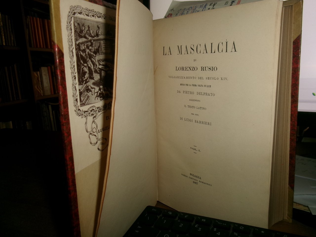 RUSIO, Lorenzo. Bologna, G. Romagnoli, 1867. La MASCALCIA. Volgarizzamento del secolo XIV. Messo per la prima volta in luce da Pietro Delprato, aggiuntovi il testo latino per cura di Luigi Barbieri. In-8°, 2 volumi rilegati assieme in m. pergamena coeva con angoli, dorso decorato in oro. viii, 447 pp.; 339, (1) pp. Il volume II è dedicato alle Notizie storiche degli scrittori italiani di veterinaria con ampie notizie bibliografiche. Questa pregevole edizione fa parte della Collezione di opere inedite e rare dei primi tre secoli della lingua e se ne tirarono soli 560 esemplari. Zambrini, 887-88. Bell' esemplare. Neg. Mass. H - H