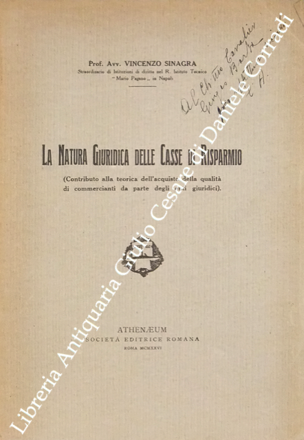 La natura giuridica delle casse di risparmio (Contributo alla teorica dell'acquisto della qualità di commercianti da parte degli enti giuridici) | Libros antiguos y modernos | Sinagra Vincenzo