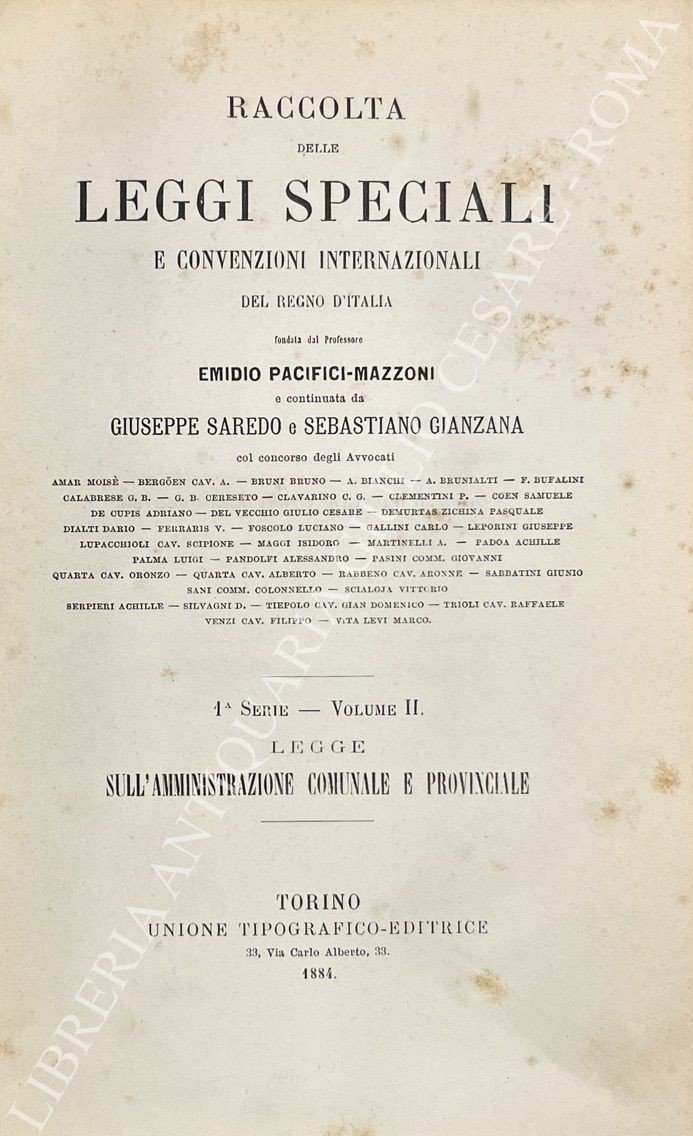 La nuova legge sulla amministrazione comunale e provinciale. (All. A della legge 20 marzo 1865, n. 2248 per l'unificazione amministrativa del Regno d'Italia) annotata dall'avv. Achille Serpieri dall'articolo 1 al 12 e continuata da G. Saredo, Consigliere di Cassazione e da A. Bergoen, Segretario del Consiglio di Stato