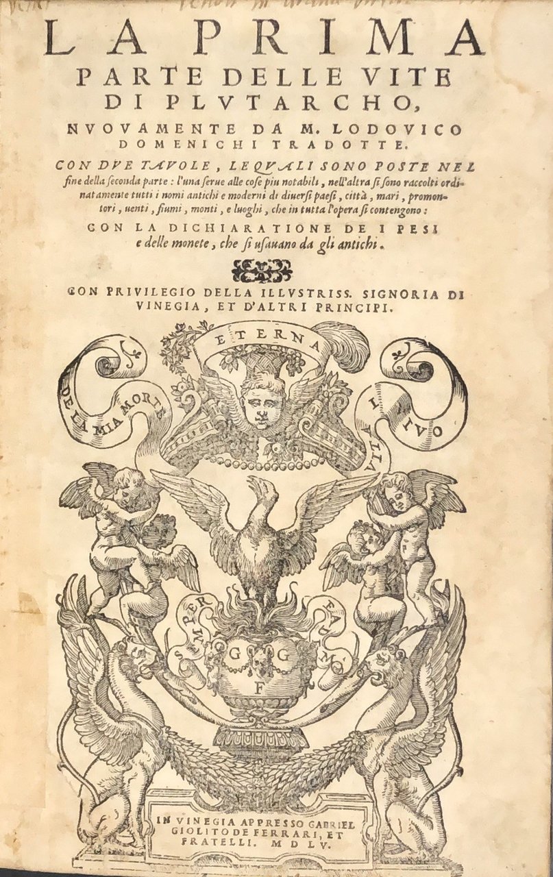 La prima parte delle vite di Plutarco, nuovamente da M. Lodovico Domenichi tradotte. Con due tavole, le quali sono poste nel fine della seconda parte. Con la dichiaratione dei pesi e delle monete, che si usavano da gli antichi