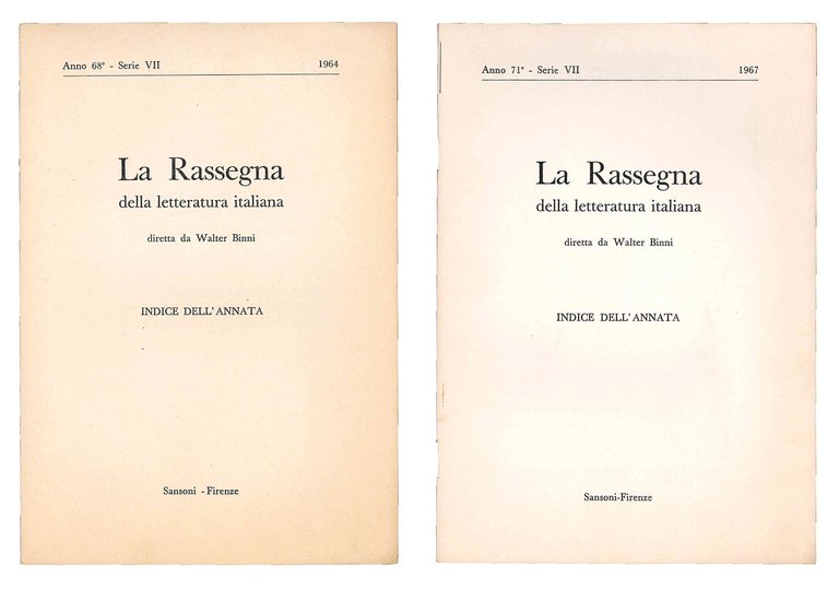 La rassegna della letteratura italiana. Lotto di 12 fascicoli: 1953, nr. 1-2, 3, 4; 1954, nr. 1, 2, 3, 4; 1958, nr. 1; 1961, nr. 2; 1965, nr. 1; due fascicoli 'Indice dell'annata', anno 68, 1964, serie VII e anno 71, 1967, serie VII. | Libros antiguos y modernos | BINNI, Walter (a cura di)
