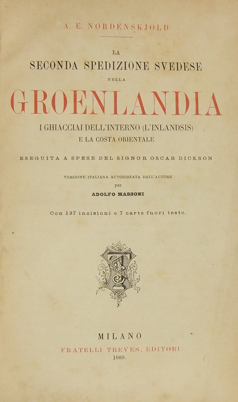 La seconda spedizione svedese nella Groenlandia. I ghiacciai dell'interno (l'Inlandsis) e la costa orientale. Eseguita a spese del signor Oscar Dickson. Versione italiana autorizzata dall'Autore per Adolfo Massoni. Con 137 incicioni e 7 carte fuori testo