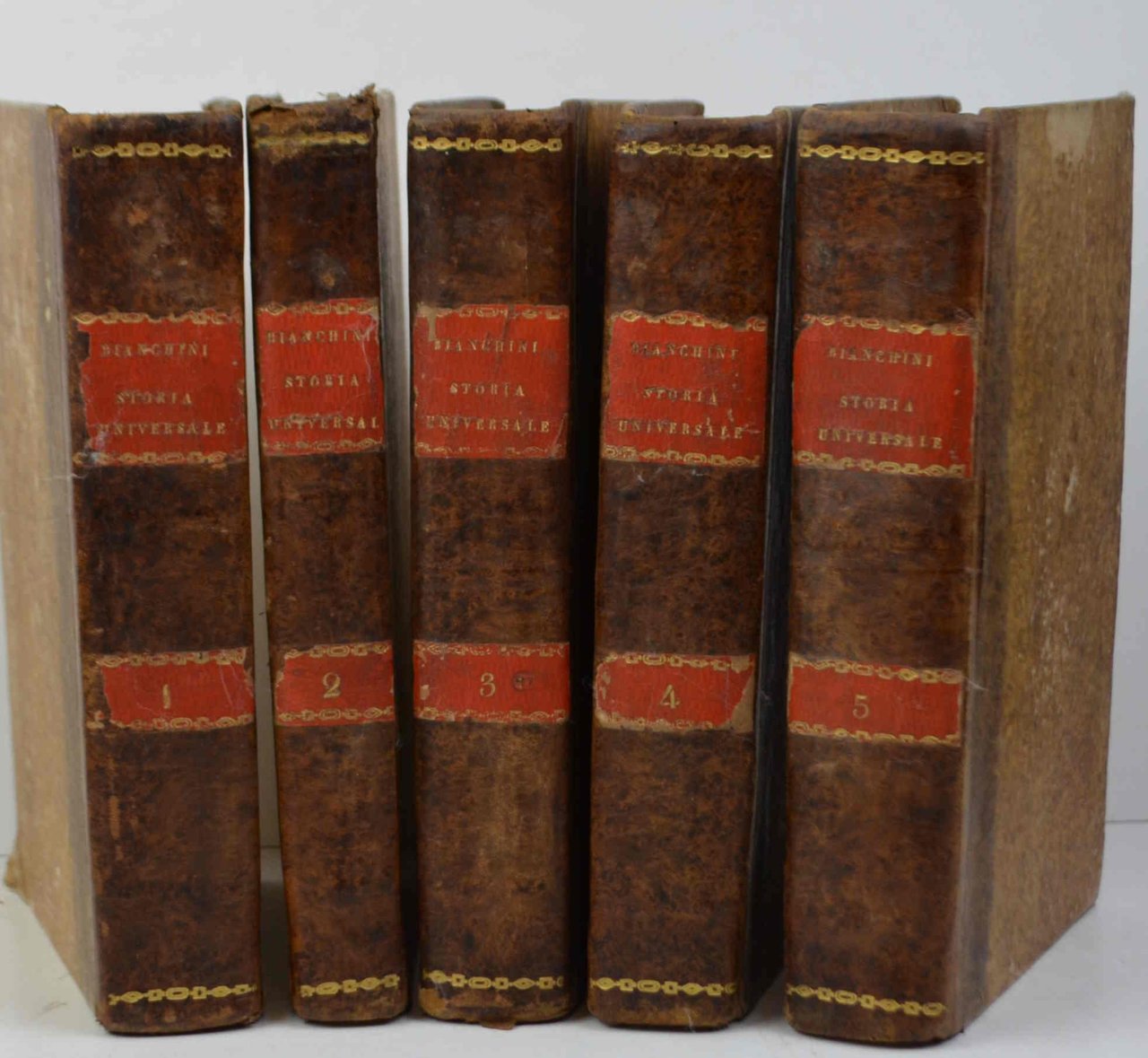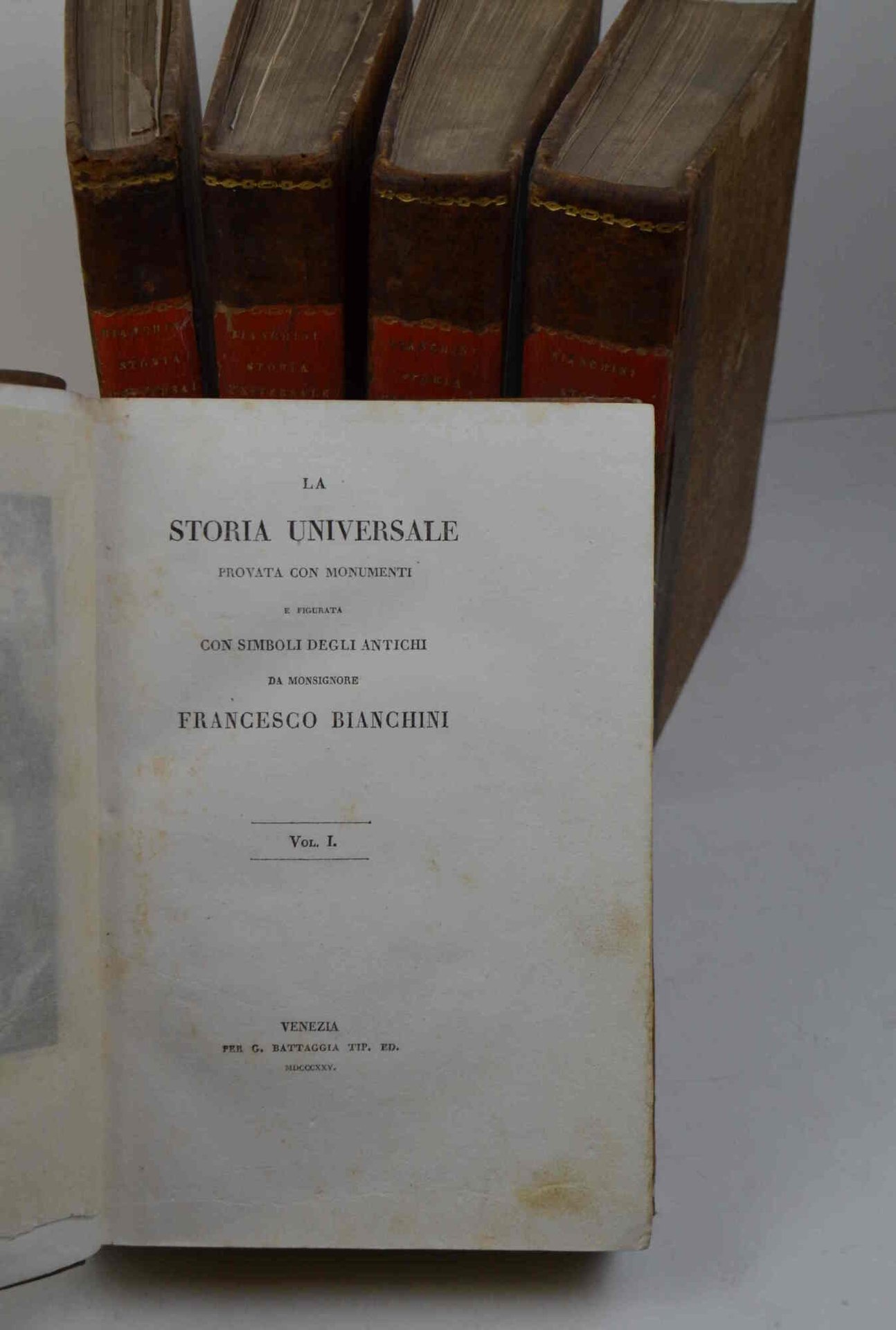Cinque volumi di cm. 22,5. pp. xliv, 276; 191; 315; 320; 221 + (64) d'indici ed elenco associati + (4) con l'elenco delle opere del Bianchini. Con varie tabelle ripiegate e 76 tavole incise fuori testo, tra cui il ritratto ed una carta geografica (ciascuna protetta da velina). Legatura coeva in mezza pelle, dorsi lisci con fregi in oro e titoli su doppi tasselli. Esemplare genuino ed in buono stato di conservazione. Cfr. Cicognara: "...opera utilissima per la cronologia, la storia e l'antiquaria...". Terza ediz. fatta sull'orig. di Roma, 1697. Gamba (1798): "Migliore d'ogni altra è la edizione moderna di Venezia, Battaggia, 1825-28...".