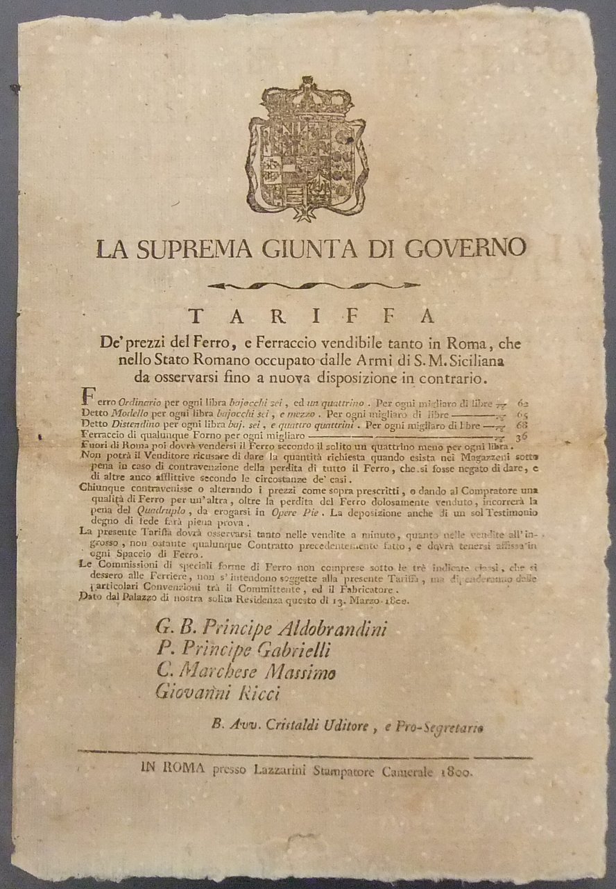 La suprema giunta di governo. Tariffa de' prezzi del Ferro e Ferraccio vendibile tanto in Roma, che nello Stato Romano occupato dalle Armi di S. M. Siciliana da osservarsi fino a nuova disposizione in contrario | Libros antiguos y modernos | Ferdinando Iv - Principe Aldobrandini