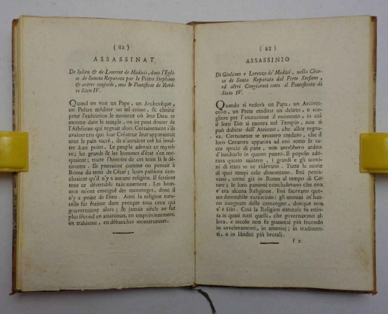 Un volume (13,5x21 cm) di 131 pagine su carta pesante, testo in francese, a sinistra, con testo italiano a fronte. Dopo il titolo: «.seguita dagli estratti del Saggio sulla storia generale e sulli costumi e lo spirito delle nazioni, dei pensieri sull'amministrazione pubblica dell'Istoria dei Quakers, sul Teismo e della corrispondenza generale di Voltaire. Dal cittadino Saint-Martin segretario della commissione del Direttorio esecutivo della Repubblica francese a Roma; membro della Società filotecnica, di quello d'Istituzione e del Liceo delle arti di Parigi» (testo anche in francese). Legatura coeva in mezza pelle ad angoli, dorso liscio con decorazioni dorate e tassello di titolo; piatti con carta marmorizzata. Ottime condizioni. Raro. “Louis Pierre de Saint-Martin (1753-1819).Conseiller à la Cour supérieure de Liège. A été abbé et avocat au Parlement de Paris, aumônier général de la Garde nationale et commissaire du Directoire exécutif à Rome”.
