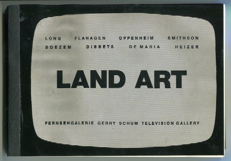Volume stampato in occasione del primo programma televisivo pubblico sulla Land Art, dal titolo "Land Art", della durata di 38 minuti, andato in onda il 15 Aprile 1969 alle 22.40 a Berlino. Progetto sostenuto dalla Fernsehgalerie Gerry Schum Television Gallery, Berlino. Prima pagina ripiegata con foto in bianco e nero delle opere degli artisti protagonisti del programma. Numerose fotografie in bianco e nero delle installazioni, dei lavori, disegni e fac-simili di testi manoscritti di Richard Long (Stone Cross; Walking a straight 10 mile line forward and back shooting every half mile); Barry Flanagan (Ring and line sand work; Hole in the sea); Dennis Oppenheim (Tracks in maize field; Timetrack. Following the timeborder between USA e Canada); Bob Smithson (Dog Tracks; Fossil quarry mirror with four mirror displacements); Marinus Boezem (Windows; Sandfountain); Jean Dibbets (Grasrol; 12 Hours tide object with correction of perspective); Walter De Maria ( Half-Mile Long Drawing; Two lines three circles on the desert ); Mike Heizer (Excavations; Coyote). Biografie e Bibliografia degli artisti. In appendice selezione dei commenti della stampa sul programma Testo stampato su carta e fogli traslucidi. Copertina con titolo stampato su foglio in acetato. Stampa di Peter Dahlhausen, Köln. 8vo (cm 14,5x20,5). pp. 260. . Molto buono (Very Good). Dorso restaurato professionalmente (Professional restauration of the spine). Prima edizione (First Edition). . "During all the 38 minutes of the Land Art show there is no word spoken. No explanation. I think an art object realized in regard of the medium TV does not need a spoken explanation". Gerry Schum
