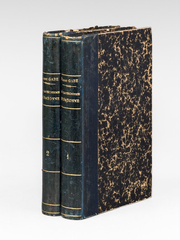2 vol. in-12 rel. demi-basane bleue, Edouard Privat Libraire-éditeur, Toulouse, s.d., 504 et 460 pp. Etat très satisfaisant pour cet ensemble auquel ne manque que le Tome 3 (Grâce, Sacrements, Fêtes). Ouvrage écrit par un prêtre du diocèse de Bayonn et recommandé par le célèbre Cardinal Lavigerie. Titre complet : Le catéchisme de Bayonne, expliqué et commenté question par question, avec la réfutation des principales erreurs et objections anciennes et modernes, de nombreux traits historiques fondus dans le texte ou mis au bas des pages, et une table analytique.