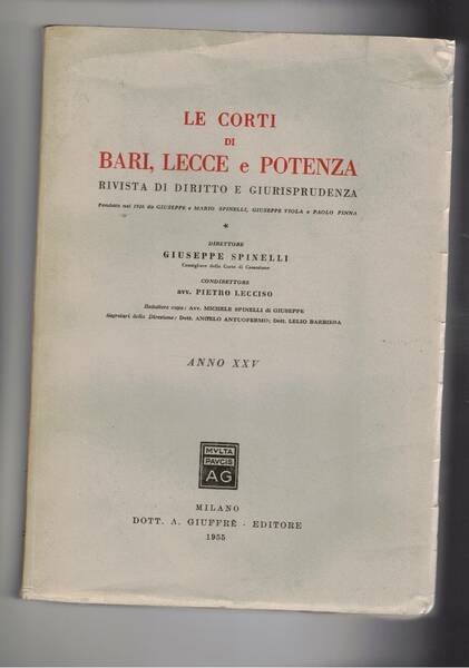 Le corti di Bari, Lecce e Potenza, rivistra di diritto e giurisprudenza anno XXV°. | Libros antiguos y modernos | Spinelli Giuseppe Direttore.
