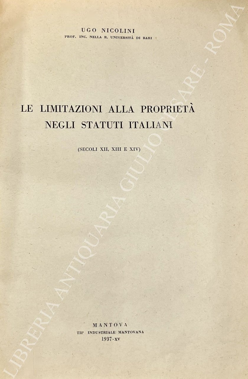 Le limitazioni alla proprietà negli Statuti italiani (secoli XII, XIII e XIV) | Libros antiguos y modernos | Nicolini Ugo