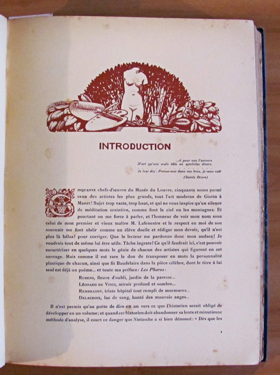 Belle testatine in sanguigna n.t., tavole monocromatiche f.t. e 49 tavole a colori f.t. applicate su cartoncino (manca la tavola N.50 "Napoleone a Solferino" di Meissonier) ciascuna preceduta da una pagina di descrizione dell'opera e di biografia dell'autore. Ed. Flammarion Lapina - Paris, s.d. 1920 circa. Rilegato in mezza pelle, con nervi e titoli in oro al dorso, con copertine originali in brossura conservate all'interno. Lievi fioriture del tempo in qualche pagina, ma libro freschissimo e in Ottimo stato. 28x38. Raro e Ottimo. , Ottimo (Fine)