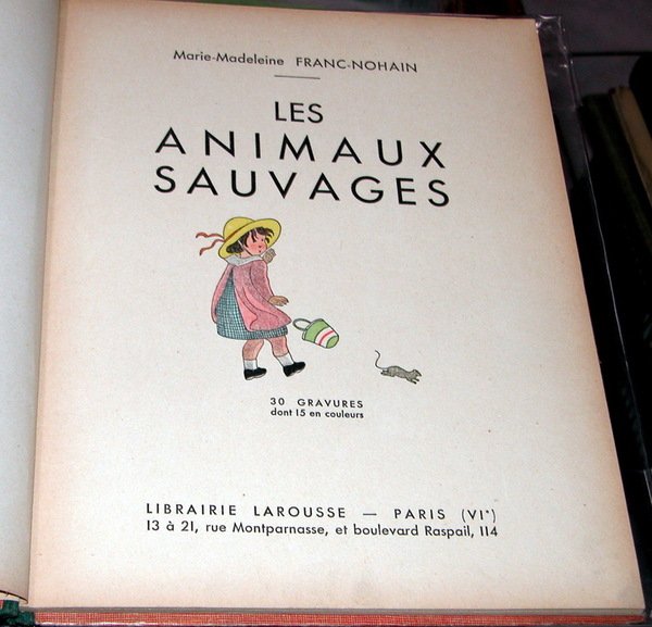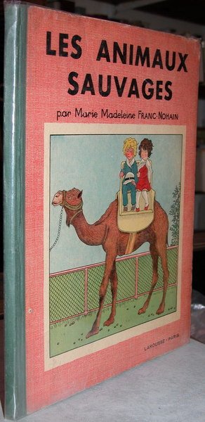 32p.; 30 grandes vignettes dont 15 en couleurs, petite vignette couleurs sur le titre. Bon état sauf bords frottés, avec petit manque de papier de couvrure à 1 coin supérieur du 2nd plat. 1ère édition de cet album d'images publié par l'illustratrice pour enfants Marie-Madeleine FRANC-NOHAIN (1878-1942): alternance d'images en noir et en couleurs d'animaux sauvages, charmants petits tableaux naïfs aux décors dépouillés, légendées d'une petite histoire amusante. Cartonnage éditeur au dos percaliné vert; 1er plat illustré couleurs.