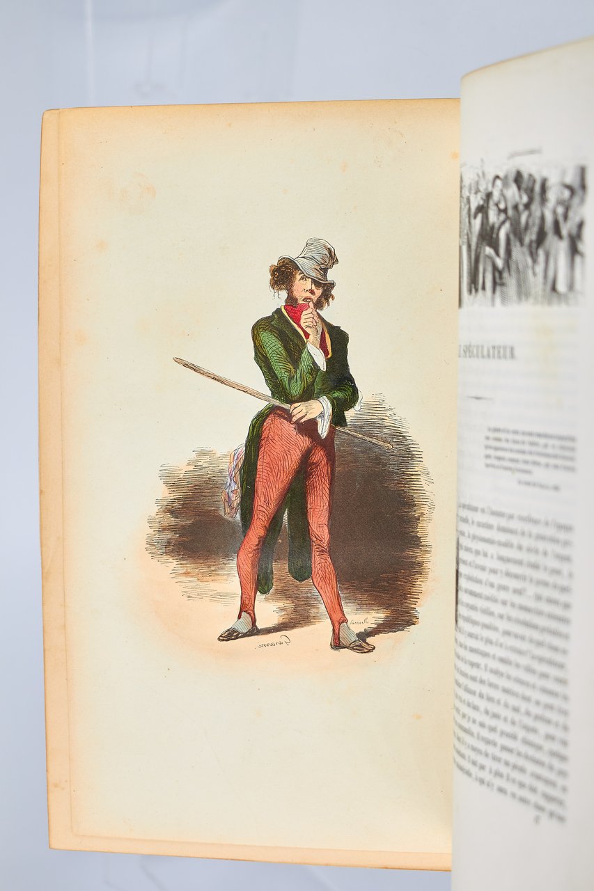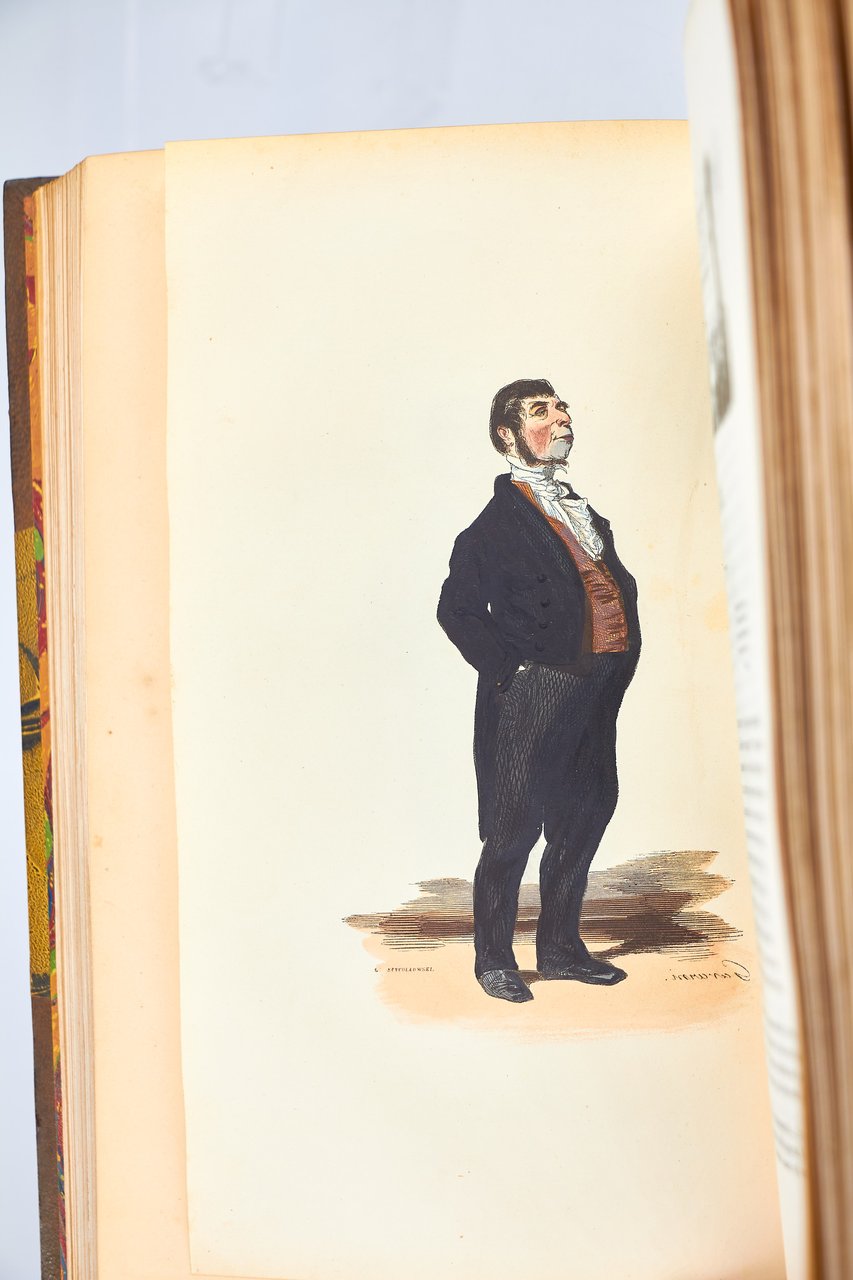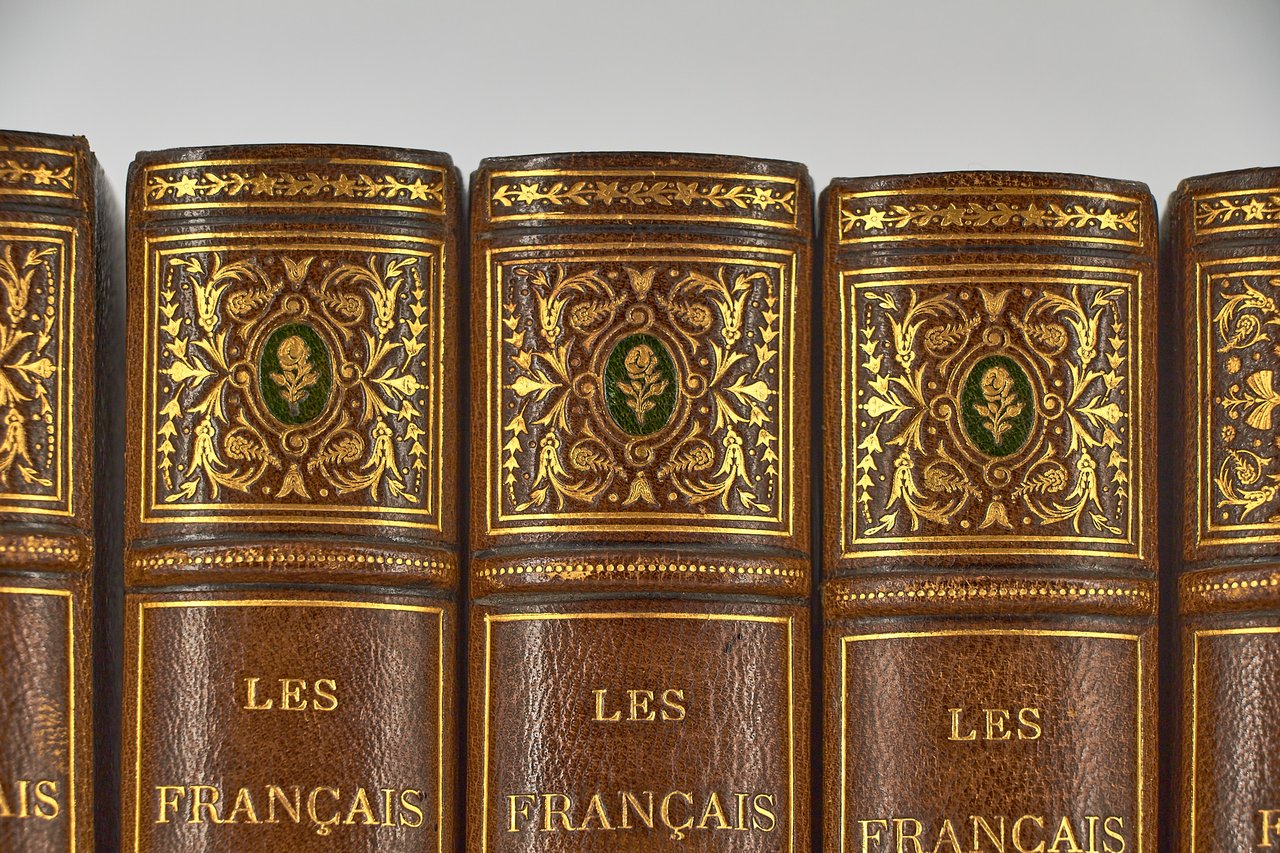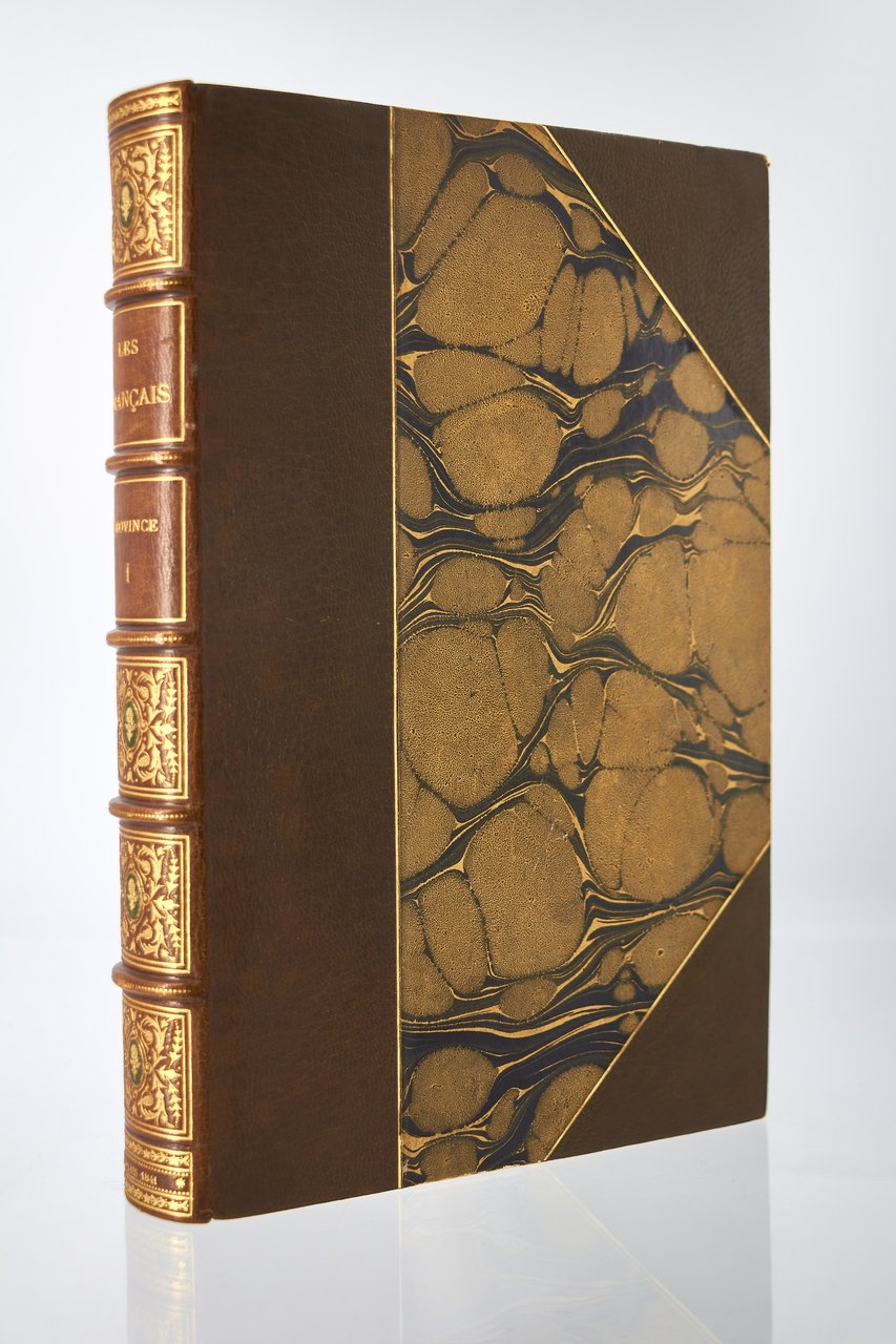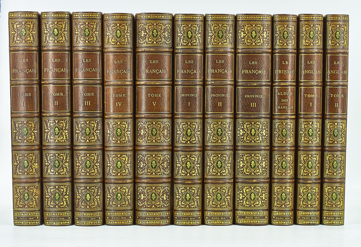 Léon Curmer | Paris 1840-1842 | 18 x 26.50 cm | 11 volumes reliés | Les Français peints par eux-mêmes. Encyclopédie morale du dix-neuvième siècle – Le Prisme [with] Les Anglais peints par eux-mêmes [The French painted by themselves – The English painted by themselves] Léon Curmer | Paris 1840-1842 | 18 x 26,5 cm 11 volumes in half morocco First edition, one of the grand papier (deluxe) copies with two states of the illustrations for the 8 volumes of Les Français peints par eux-mêmes: one in black on tinted paper, and one enhanced by hand using the so-called “coloris gommé” technique with watercolour and varnish on white paper. Les Anglais peints par eux-mêmes includes the engravings in black. No deluxe copies in colour have been made for this rare set of Les Français. Bound in half brown morocco, spine in five compartments enhanced with stipple engraving and double gilt panels richly decorated with gilt floral motifs framing a mosaic medallion of green morocco with a gilt rose stamped in the center, cartouches at the top decorated with a gilt garland framing the place and publication date, some light minor rubbing on some compartments, gilt fillets on the marbled paper boards, comb-patterned endpapers, top edges gilt. Elegant late nineteenth century bindings signed Durvand-Thiret. Complete with all engravings along with added engravings, i.e. 930 engravings including 415 in colour. Title pages dated 1841 for all volumes of Les Français except for volume 5 of Les Parisiens and volume 3 of La Province dated 1842. Les Français peints par eux-mêmes has 415 engravings in black (including that of Napoleon on horseback) instead of the 405 announced and 415 in colour including a double page map of France in volume III of the Province. The English volume illustrated by Kenny Meadous is complete with 100 plates in black. This unique set contains in total almost a thousand black and coloured engravings and more than 1500 in-text illustrations. Famous gallery of woodcut portraits depicting the social classes of the 19th century by the greatest artists of the time: Gavarni, Daumier, Delacroix, Grandville, Johannot, Bellangé, Charlet, Daubigny, etc. The portraits are all accompanied by original texts from the most famous Romantic authors, including: Balzac, Nodier, Gautier, Nerval, Gozlan, Janin, Karr, etc. Scarce foxing affecting mainly the Prism and the Anglais. The texts and illustrations of the book paint a lively picture of inhabitants and their trade in metropolitan France and its colonies. It sets the tone for panoramic literature – a new genre coined by Walter Benjamin in Charles Baudelaire. A lyric poet at the height of capitalism. In addition to these portraits of the Français, “the contribution of a whole areopagus of great and small authors and illustrators” (S. Le Men, “La 'littérature panoramique' dans la genèse de la Comédie Humaine: Balzac et Les Français peints par eux-mêmes”, L'Année balzacienne 2002/1 (No. 3) CAIRN) includes some of the most renowned authors and cartoonists of the time, each of whom made an original creation for the project. This protean fresco was directed by editor Léon Curmer, already known for the publishing success of Paul et Virginie between 1836 and 1838. Curmer is represented here by an article, “L'éditeur” in volume IV written by Elias Regnault. The latter takes example in Louis-Sebastien Mercier's Tableau de Paris, published in 1781, whose vision is even further extended by the representation of French provinces in Les Français. Thanks to Curmer the work finds an even deeper meaning: “the editor has widened his frame, and instead of letting a few fleeting portraits get lost in the immense daily whirlwind that engulfs all things, he has sought to bring together the most salient physiognomies of that time.” (S. Le Men, Ibid.) Curmer selected the authors and illustrators closest to the ones they depict: “It is therefore a question of calling upon authors and illustrators who are wel