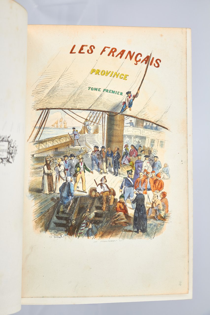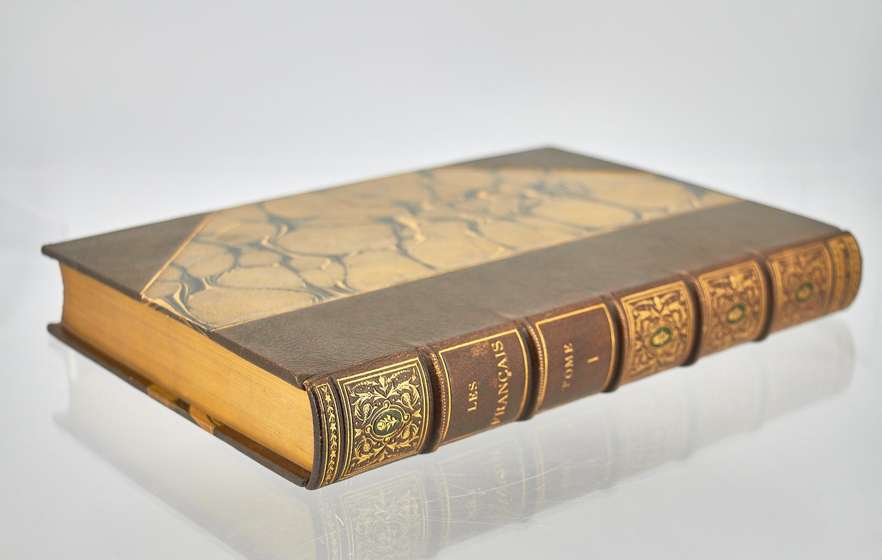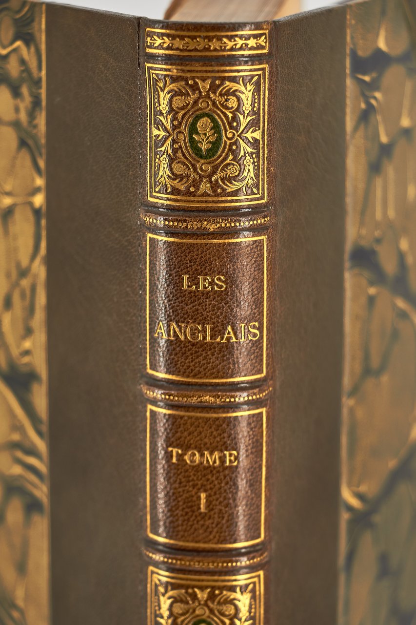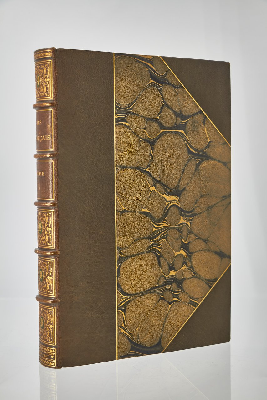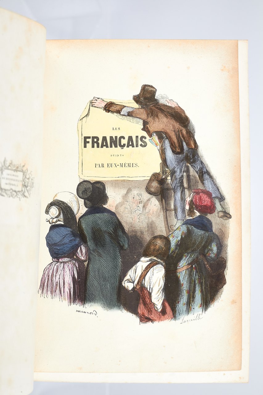 Léon Curmer | Paris 1840-1842 | 18 x 26.50 cm | 11 volumes reliés | Les Français peints par eux-mêmes. Encyclopédie morale du dix-neuvième siècle – Le Prisme [with] Les Anglais peints par eux-mêmes [The French painted by themselves – The English painted by themselves] Léon Curmer | Paris 1840-1842 | 18 x 26,5 cm 11 volumes in half morocco First edition, one of the grand papier (deluxe) copies with two states of the illustrations for the 8 volumes of Les Français peints par eux-mêmes: one in black on tinted paper, and one enhanced by hand using the so-called “coloris gommé” technique with watercolour and varnish on white paper. Les Anglais peints par eux-mêmes includes the engravings in black. No deluxe copies in colour have been made for this rare set of Les Français. Bound in half brown morocco, spine in five compartments enhanced with stipple engraving and double gilt panels richly decorated with gilt floral motifs framing a mosaic medallion of green morocco with a gilt rose stamped in the center, cartouches at the top decorated with a gilt garland framing the place and publication date, some light minor rubbing on some compartments, gilt fillets on the marbled paper boards, comb-patterned endpapers, top edges gilt. Elegant late nineteenth century bindings signed Durvand-Thiret. Complete with all engravings along with added engravings, i.e. 930 engravings including 415 in colour. Title pages dated 1841 for all volumes of Les Français except for volume 5 of Les Parisiens and volume 3 of La Province dated 1842. Les Français peints par eux-mêmes has 415 engravings in black (including that of Napoleon on horseback) instead of the 405 announced and 415 in colour including a double page map of France in volume III of the Province. The English volume illustrated by Kenny Meadous is complete with 100 plates in black. This unique set contains in total almost a thousand black and coloured engravings and more than 1500 in-text illustrations. Famous gallery of woodcut portraits depicting the social classes of the 19th century by the greatest artists of the time: Gavarni, Daumier, Delacroix, Grandville, Johannot, Bellangé, Charlet, Daubigny, etc. The portraits are all accompanied by original texts from the most famous Romantic authors, including: Balzac, Nodier, Gautier, Nerval, Gozlan, Janin, Karr, etc. Scarce foxing affecting mainly the Prism and the Anglais. The texts and illustrations of the book paint a lively picture of inhabitants and their trade in metropolitan France and its colonies. It sets the tone for panoramic literature – a new genre coined by Walter Benjamin in Charles Baudelaire. A lyric poet at the height of capitalism. In addition to these portraits of the Français, “the contribution of a whole areopagus of great and small authors and illustrators” (S. Le Men, “La 'littérature panoramique' dans la genèse de la Comédie Humaine: Balzac et Les Français peints par eux-mêmes”, L'Année balzacienne 2002/1 (No. 3) CAIRN) includes some of the most renowned authors and cartoonists of the time, each of whom made an original creation for the project. This protean fresco was directed by editor Léon Curmer, already known for the publishing success of Paul et Virginie between 1836 and 1838. Curmer is represented here by an article, “L'éditeur” in volume IV written by Elias Regnault. The latter takes example in Louis-Sebastien Mercier's Tableau de Paris, published in 1781, whose vision is even further extended by the representation of French provinces in Les Français. Thanks to Curmer the work finds an even deeper meaning: “the editor has widened his frame, and instead of letting a few fleeting portraits get lost in the immense daily whirlwind that engulfs all things, he has sought to bring together the most salient physiognomies of that time.” (S. Le Men, Ibid.) Curmer selected the authors and illustrators closest to the ones they depict: “It is therefore a question of calling upon authors and illustrators who are wel