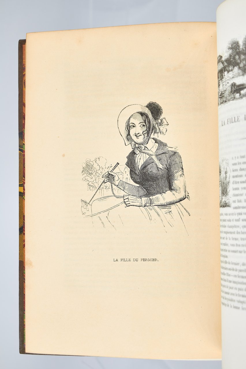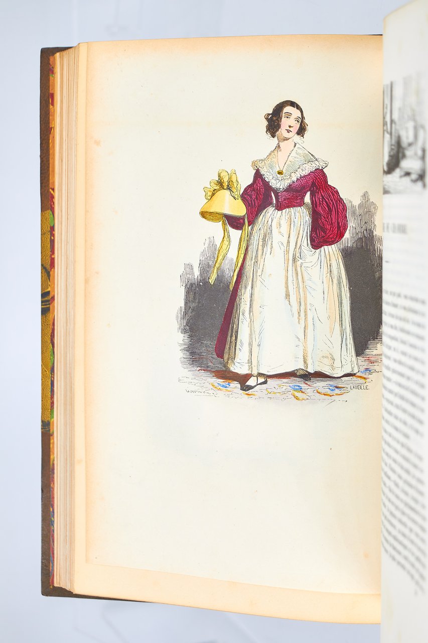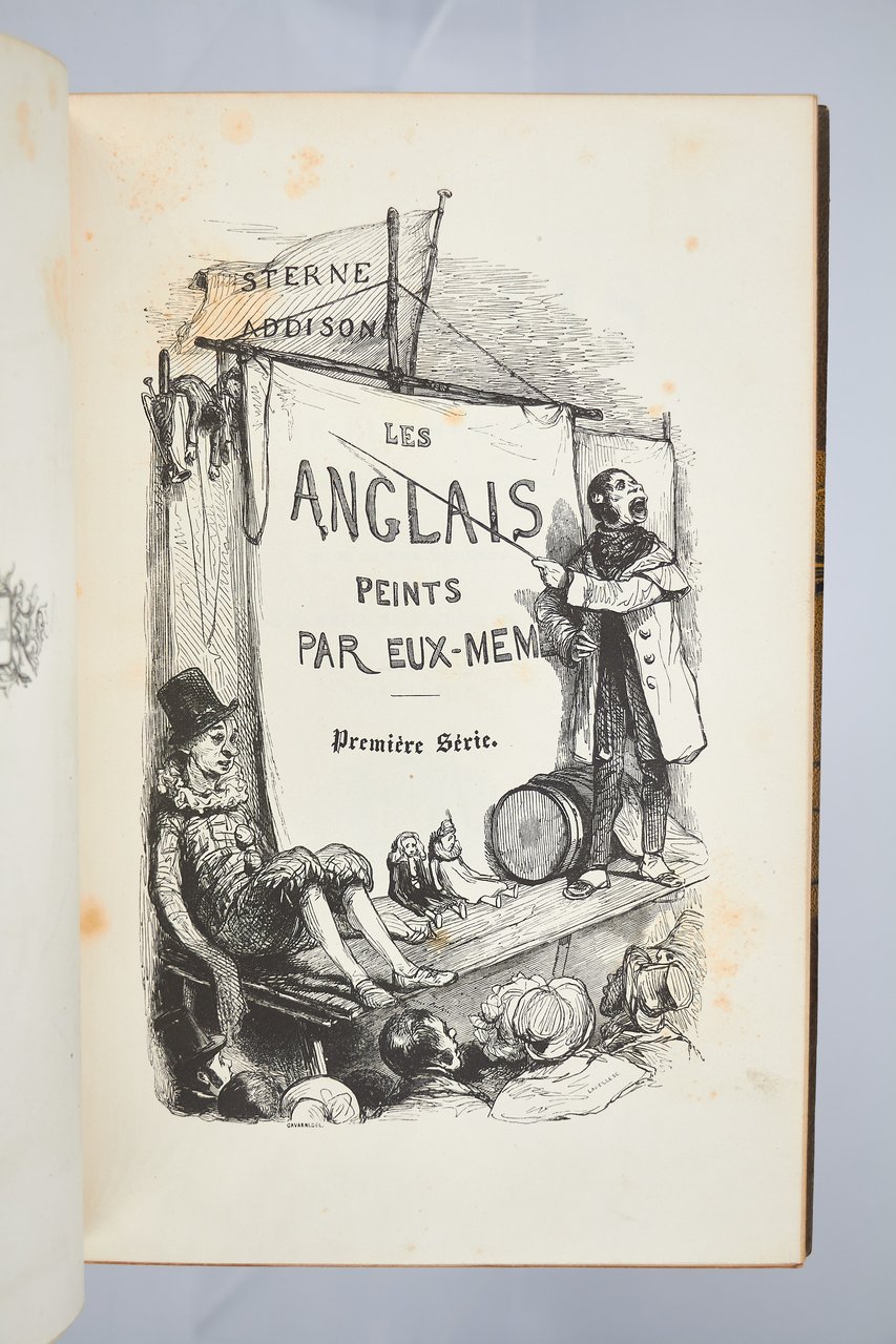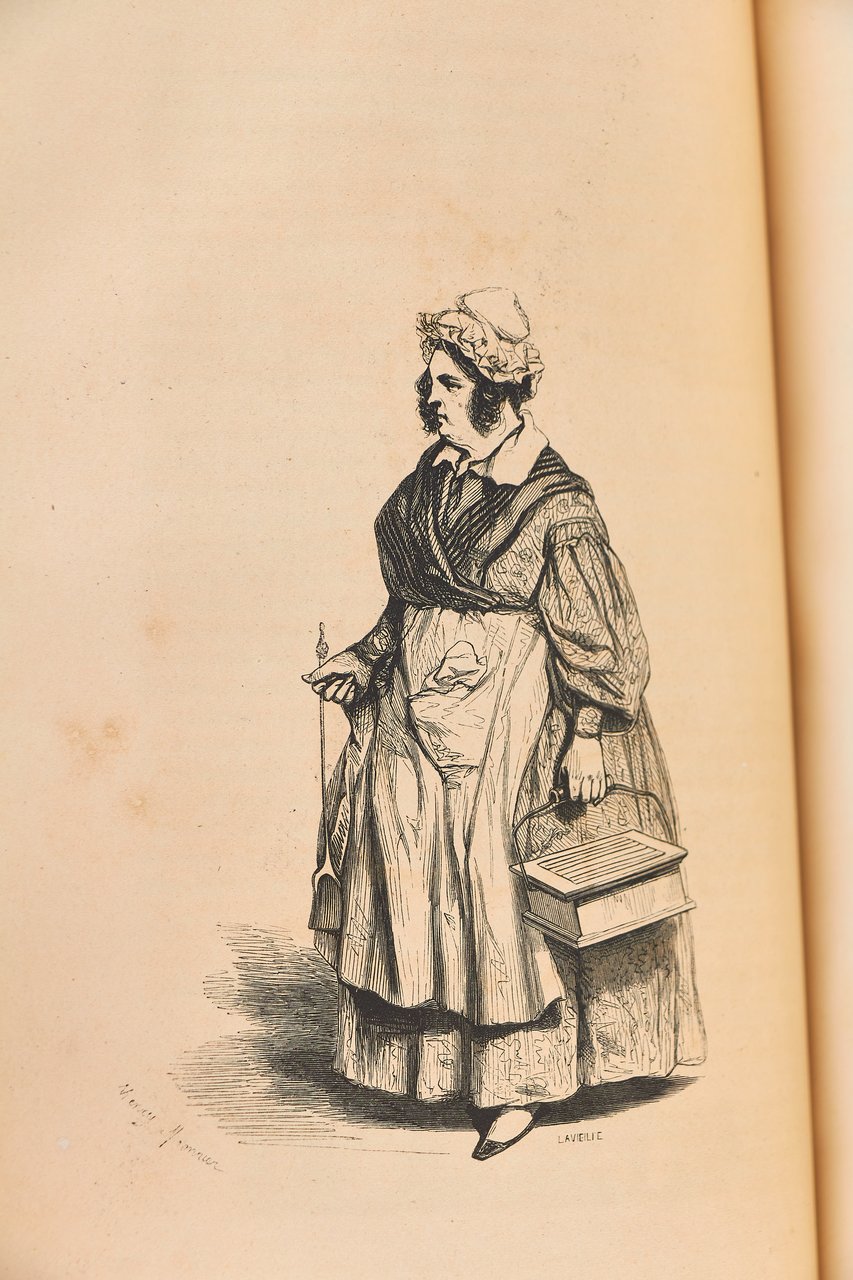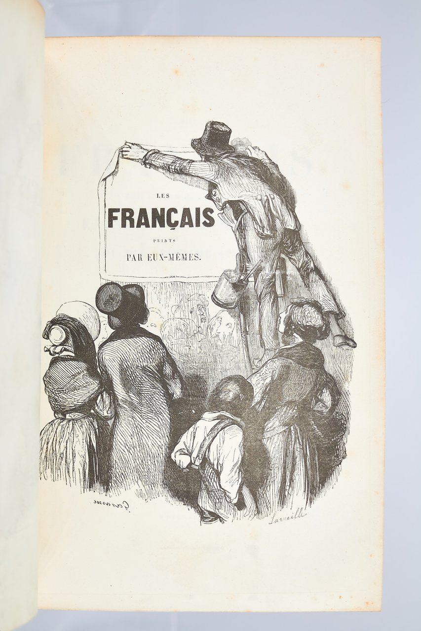 Léon Curmer | Paris 1840-1842 | 18 x 26.50 cm | 11 volumes reliés | Les Français peints par eux-mêmes. Encyclopédie morale du dix-neuvième siècle – Le Prisme [with] Les Anglais peints par eux-mêmes [The French painted by themselves – The English painted by themselves] Léon Curmer | Paris 1840-1842 | 18 x 26,5 cm 11 volumes in half morocco First edition, one of the grand papier (deluxe) copies with two states of the illustrations for the 8 volumes of Les Français peints par eux-mêmes: one in black on tinted paper, and one enhanced by hand using the so-called “coloris gommé” technique with watercolour and varnish on white paper. Les Anglais peints par eux-mêmes includes the engravings in black. No deluxe copies in colour have been made for this rare set of Les Français. Bound in half brown morocco, spine in five compartments enhanced with stipple engraving and double gilt panels richly decorated with gilt floral motifs framing a mosaic medallion of green morocco with a gilt rose stamped in the center, cartouches at the top decorated with a gilt garland framing the place and publication date, some light minor rubbing on some compartments, gilt fillets on the marbled paper boards, comb-patterned endpapers, top edges gilt. Elegant late nineteenth century bindings signed Durvand-Thiret. Complete with all engravings along with added engravings, i.e. 930 engravings including 415 in colour. Title pages dated 1841 for all volumes of Les Français except for volume 5 of Les Parisiens and volume 3 of La Province dated 1842. Les Français peints par eux-mêmes has 415 engravings in black (including that of Napoleon on horseback) instead of the 405 announced and 415 in colour including a double page map of France in volume III of the Province. The English volume illustrated by Kenny Meadous is complete with 100 plates in black. This unique set contains in total almost a thousand black and coloured engravings and more than 1500 in-text illustrations. Famous gallery of woodcut portraits depicting the social classes of the 19th century by the greatest artists of the time: Gavarni, Daumier, Delacroix, Grandville, Johannot, Bellangé, Charlet, Daubigny, etc. The portraits are all accompanied by original texts from the most famous Romantic authors, including: Balzac, Nodier, Gautier, Nerval, Gozlan, Janin, Karr, etc. Scarce foxing affecting mainly the Prism and the Anglais. The texts and illustrations of the book paint a lively picture of inhabitants and their trade in metropolitan France and its colonies. It sets the tone for panoramic literature – a new genre coined by Walter Benjamin in Charles Baudelaire. A lyric poet at the height of capitalism. In addition to these portraits of the Français, “the contribution of a whole areopagus of great and small authors and illustrators” (S. Le Men, “La 'littérature panoramique' dans la genèse de la Comédie Humaine: Balzac et Les Français peints par eux-mêmes”, L'Année balzacienne 2002/1 (No. 3) CAIRN) includes some of the most renowned authors and cartoonists of the time, each of whom made an original creation for the project. This protean fresco was directed by editor Léon Curmer, already known for the publishing success of Paul et Virginie between 1836 and 1838. Curmer is represented here by an article, “L'éditeur” in volume IV written by Elias Regnault. The latter takes example in Louis-Sebastien Mercier's Tableau de Paris, published in 1781, whose vision is even further extended by the representation of French provinces in Les Français. Thanks to Curmer the work finds an even deeper meaning: “the editor has widened his frame, and instead of letting a few fleeting portraits get lost in the immense daily whirlwind that engulfs all things, he has sought to bring together the most salient physiognomies of that time.” (S. Le Men, Ibid.) Curmer selected the authors and illustrators closest to the ones they depict: “It is therefore a question of calling upon authors and illustrators who are wel