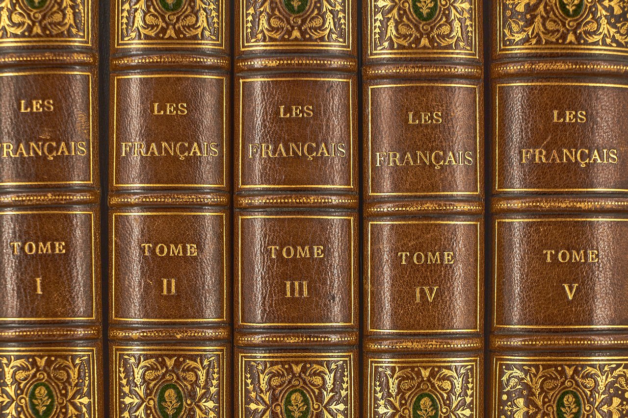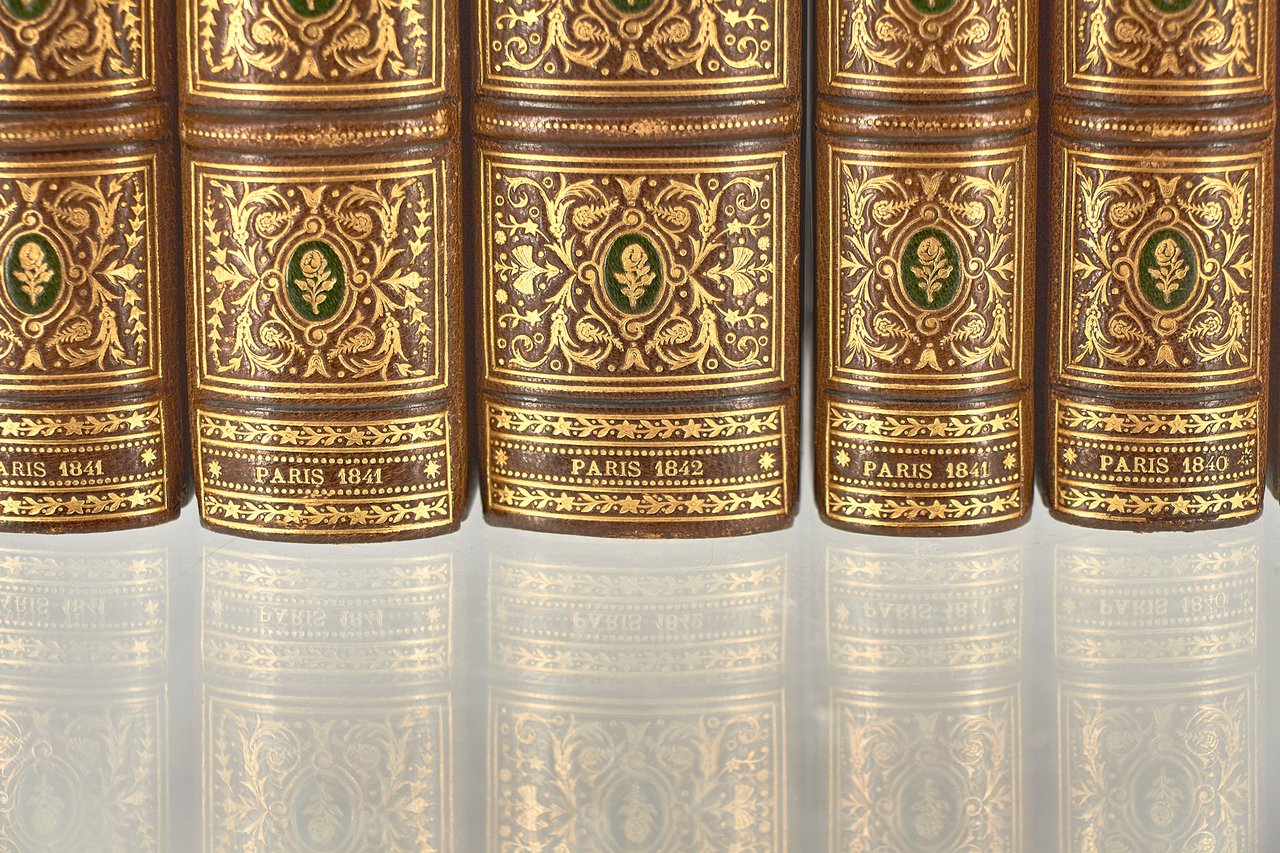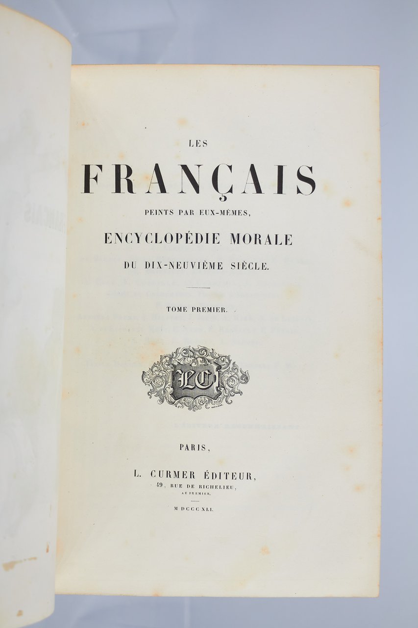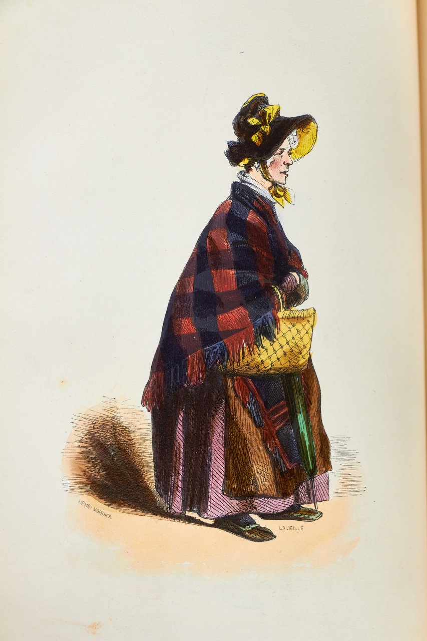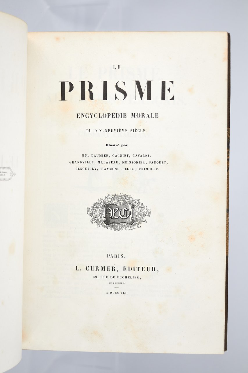 Léon Curmer | Paris 1840-1842 | 18 x 26.50 cm | 11 volumes reliés | Les Français peints par eux-mêmes. Encyclopédie morale du dix-neuvième siècle – Le Prisme [with] Les Anglais peints par eux-mêmes [The French painted by themselves – The English painted by themselves] Léon Curmer | Paris 1840-1842 | 18 x 26,5 cm 11 volumes in half morocco First edition, one of the grand papier (deluxe) copies with two states of the illustrations for the 8 volumes of Les Français peints par eux-mêmes: one in black on tinted paper, and one enhanced by hand using the so-called “coloris gommé” technique with watercolour and varnish on white paper. Les Anglais peints par eux-mêmes includes the engravings in black. No deluxe copies in colour have been made for this rare set of Les Français. Bound in half brown morocco, spine in five compartments enhanced with stipple engraving and double gilt panels richly decorated with gilt floral motifs framing a mosaic medallion of green morocco with a gilt rose stamped in the center, cartouches at the top decorated with a gilt garland framing the place and publication date, some light minor rubbing on some compartments, gilt fillets on the marbled paper boards, comb-patterned endpapers, top edges gilt. Elegant late nineteenth century bindings signed Durvand-Thiret. Complete with all engravings along with added engravings, i.e. 930 engravings including 415 in colour. Title pages dated 1841 for all volumes of Les Français except for volume 5 of Les Parisiens and volume 3 of La Province dated 1842. Les Français peints par eux-mêmes has 415 engravings in black (including that of Napoleon on horseback) instead of the 405 announced and 415 in colour including a double page map of France in volume III of the Province. The English volume illustrated by Kenny Meadous is complete with 100 plates in black. This unique set contains in total almost a thousand black and coloured engravings and more than 1500 in-text illustrations. Famous gallery of woodcut portraits depicting the social classes of the 19th century by the greatest artists of the time: Gavarni, Daumier, Delacroix, Grandville, Johannot, Bellangé, Charlet, Daubigny, etc. The portraits are all accompanied by original texts from the most famous Romantic authors, including: Balzac, Nodier, Gautier, Nerval, Gozlan, Janin, Karr, etc. Scarce foxing affecting mainly the Prism and the Anglais. The texts and illustrations of the book paint a lively picture of inhabitants and their trade in metropolitan France and its colonies. It sets the tone for panoramic literature – a new genre coined by Walter Benjamin in Charles Baudelaire. A lyric poet at the height of capitalism. In addition to these portraits of the Français, “the contribution of a whole areopagus of great and small authors and illustrators” (S. Le Men, “La 'littérature panoramique' dans la genèse de la Comédie Humaine: Balzac et Les Français peints par eux-mêmes”, L'Année balzacienne 2002/1 (No. 3) CAIRN) includes some of the most renowned authors and cartoonists of the time, each of whom made an original creation for the project. This protean fresco was directed by editor Léon Curmer, already known for the publishing success of Paul et Virginie between 1836 and 1838. Curmer is represented here by an article, “L'éditeur” in volume IV written by Elias Regnault. The latter takes example in Louis-Sebastien Mercier's Tableau de Paris, published in 1781, whose vision is even further extended by the representation of French provinces in Les Français. Thanks to Curmer the work finds an even deeper meaning: “the editor has widened his frame, and instead of letting a few fleeting portraits get lost in the immense daily whirlwind that engulfs all things, he has sought to bring together the most salient physiognomies of that time.” (S. Le Men, Ibid.) Curmer selected the authors and illustrators closest to the ones they depict: “It is therefore a question of calling upon authors and illustrators who are wel