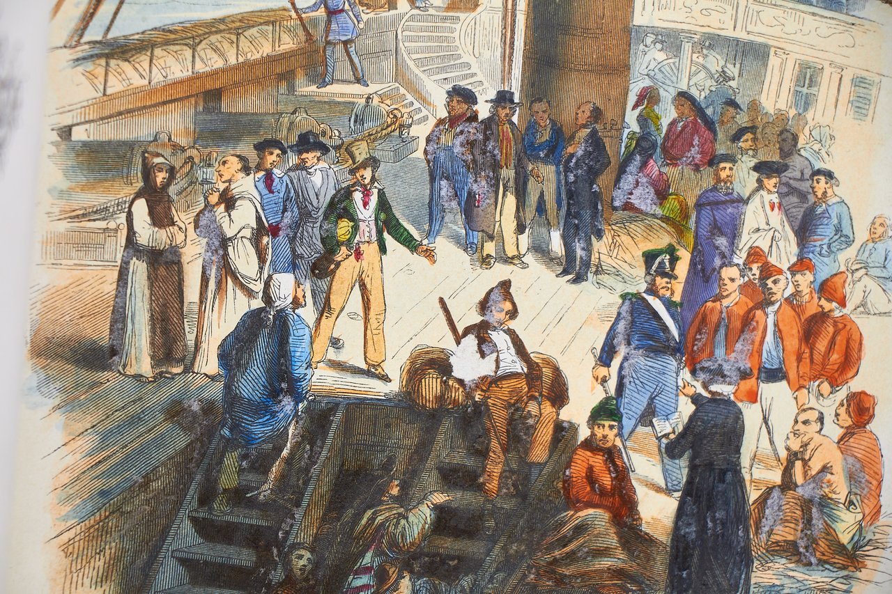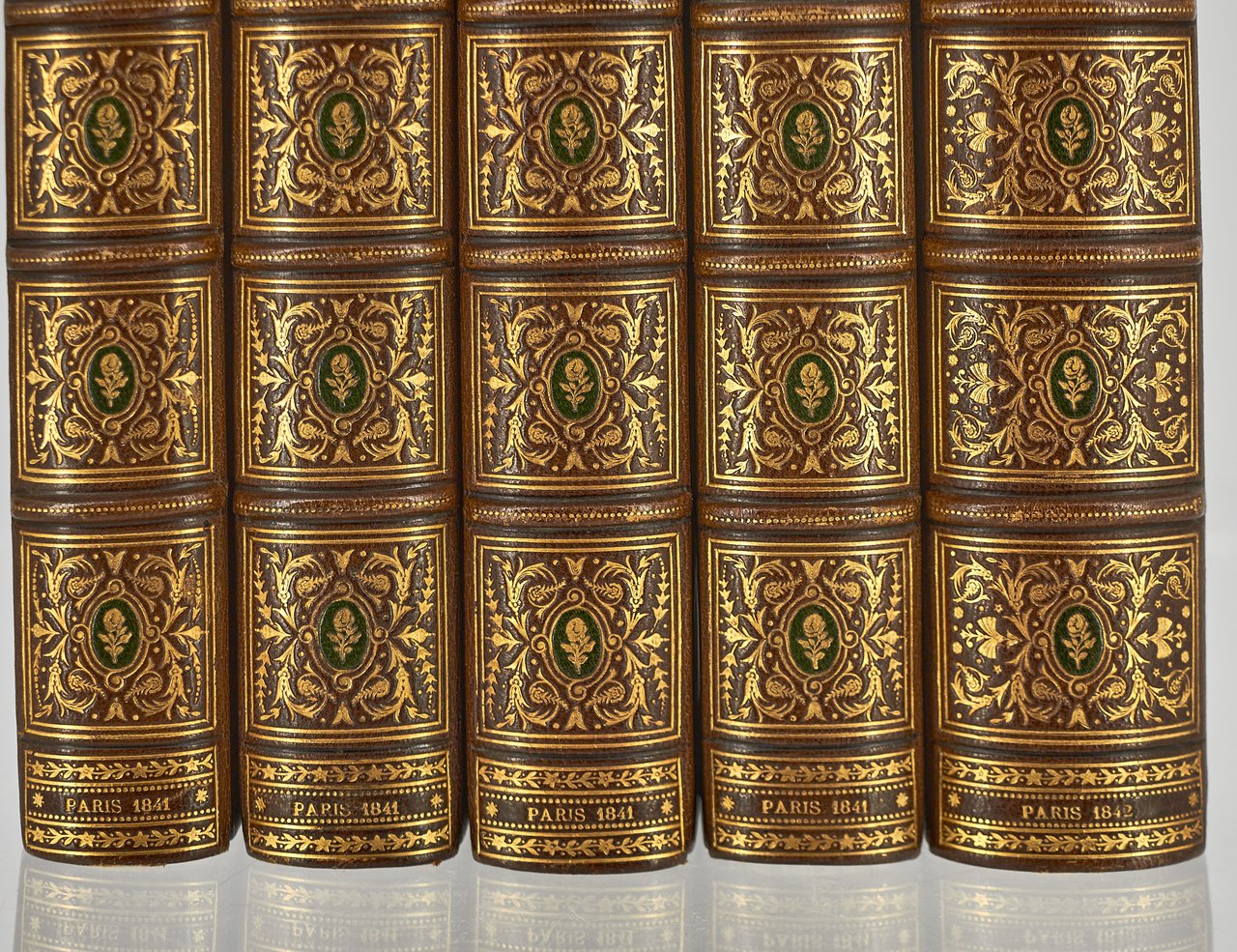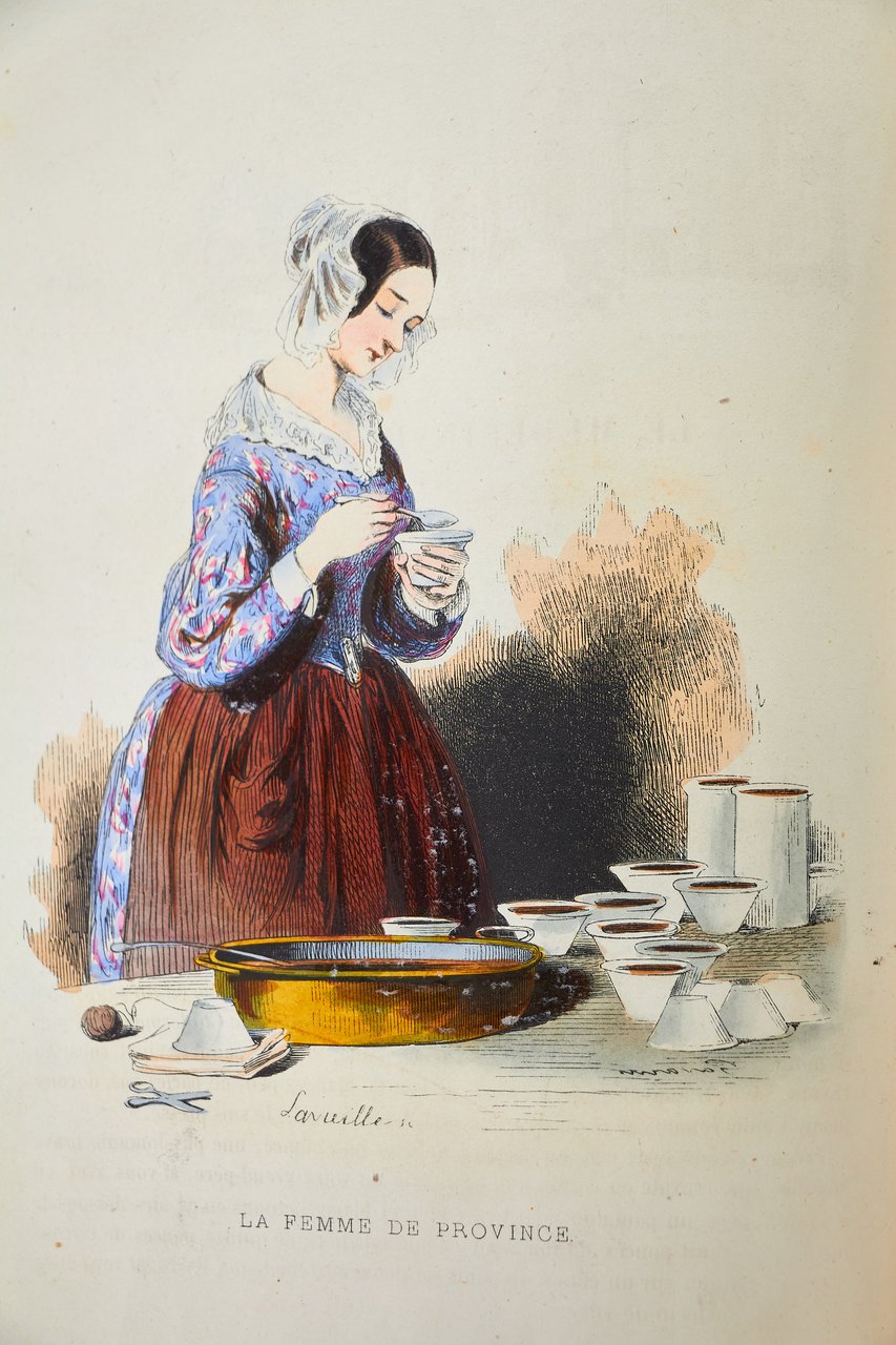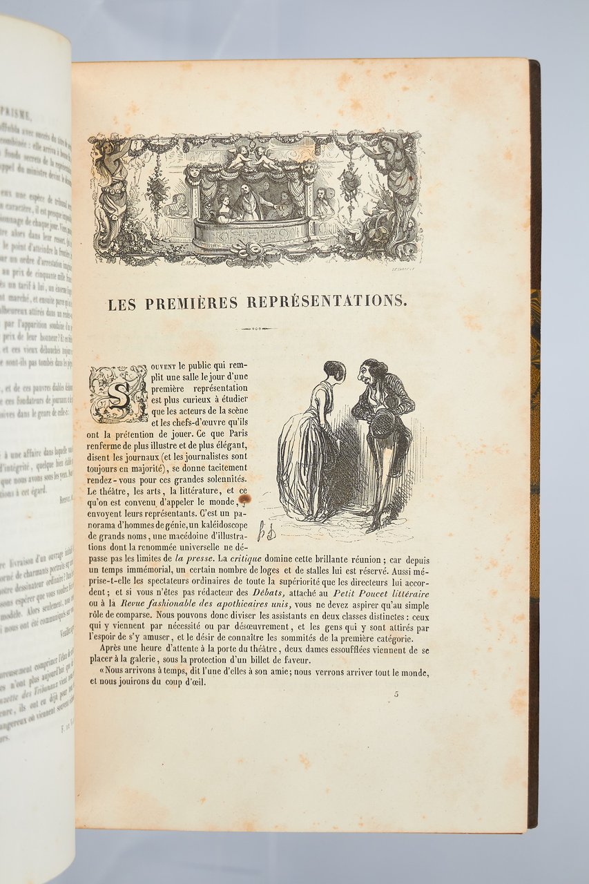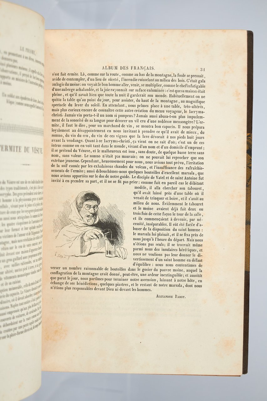 Léon Curmer | Paris 1840-1842 | 18 x 26.50 cm | 11 volumes reliés | Les Français peints par eux-mêmes. Encyclopédie morale du dix-neuvième siècle – Le Prisme [with] Les Anglais peints par eux-mêmes [The French painted by themselves – The English painted by themselves] Léon Curmer | Paris 1840-1842 | 18 x 26,5 cm 11 volumes in half morocco First edition, one of the grand papier (deluxe) copies with two states of the illustrations for the 8 volumes of Les Français peints par eux-mêmes: one in black on tinted paper, and one enhanced by hand using the so-called “coloris gommé” technique with watercolour and varnish on white paper. Les Anglais peints par eux-mêmes includes the engravings in black. No deluxe copies in colour have been made for this rare set of Les Français. Bound in half brown morocco, spine in five compartments enhanced with stipple engraving and double gilt panels richly decorated with gilt floral motifs framing a mosaic medallion of green morocco with a gilt rose stamped in the center, cartouches at the top decorated with a gilt garland framing the place and publication date, some light minor rubbing on some compartments, gilt fillets on the marbled paper boards, comb-patterned endpapers, top edges gilt. Elegant late nineteenth century bindings signed Durvand-Thiret. Complete with all engravings along with added engravings, i.e. 930 engravings including 415 in colour. Title pages dated 1841 for all volumes of Les Français except for volume 5 of Les Parisiens and volume 3 of La Province dated 1842. Les Français peints par eux-mêmes has 415 engravings in black (including that of Napoleon on horseback) instead of the 405 announced and 415 in colour including a double page map of France in volume III of the Province. The English volume illustrated by Kenny Meadous is complete with 100 plates in black. This unique set contains in total almost a thousand black and coloured engravings and more than 1500 in-text illustrations. Famous gallery of woodcut portraits depicting the social classes of the 19th century by the greatest artists of the time: Gavarni, Daumier, Delacroix, Grandville, Johannot, Bellangé, Charlet, Daubigny, etc. The portraits are all accompanied by original texts from the most famous Romantic authors, including: Balzac, Nodier, Gautier, Nerval, Gozlan, Janin, Karr, etc. Scarce foxing affecting mainly the Prism and the Anglais. The texts and illustrations of the book paint a lively picture of inhabitants and their trade in metropolitan France and its colonies. It sets the tone for panoramic literature – a new genre coined by Walter Benjamin in Charles Baudelaire. A lyric poet at the height of capitalism. In addition to these portraits of the Français, “the contribution of a whole areopagus of great and small authors and illustrators” (S. Le Men, “La 'littérature panoramique' dans la genèse de la Comédie Humaine: Balzac et Les Français peints par eux-mêmes”, L'Année balzacienne 2002/1 (No. 3) CAIRN) includes some of the most renowned authors and cartoonists of the time, each of whom made an original creation for the project. This protean fresco was directed by editor Léon Curmer, already known for the publishing success of Paul et Virginie between 1836 and 1838. Curmer is represented here by an article, “L'éditeur” in volume IV written by Elias Regnault. The latter takes example in Louis-Sebastien Mercier's Tableau de Paris, published in 1781, whose vision is even further extended by the representation of French provinces in Les Français. Thanks to Curmer the work finds an even deeper meaning: “the editor has widened his frame, and instead of letting a few fleeting portraits get lost in the immense daily whirlwind that engulfs all things, he has sought to bring together the most salient physiognomies of that time.” (S. Le Men, Ibid.) Curmer selected the authors and illustrators closest to the ones they depict: “It is therefore a question of calling upon authors and illustrators who are wel