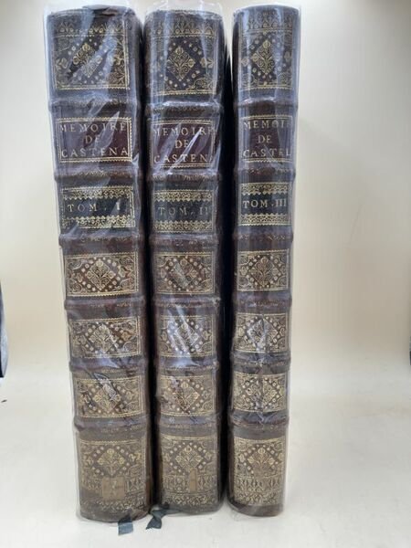 chez Jean Leonard 1731 A Bruxelles, chez Jean Leonard, 1731. Illustrez et augmentez de plusieurs commentaires et manuscrits tant lettres, instructions, traitez, qu'autres pièces secrètes et originales, servans à donner la vérité de l'Histoire des règnes de Francois II, Charles IX et Henry III et de la Régence et du gouvernement de Catherine de Médicis. Avec les éloges des Rois, Reines, Prince & autres personnes illustres del'une & de l'autre Religion sous ces trois règnes, l'histoire généalogique de la Maison de Castelnau, et les généalogies de plusieurs maisons illustres alliées à celle de Castelnau, par J. Le Laboureur. Nouvelle édition, revue avec soin et augmentée de plusieurs manuscrits. Avec près de 400 armoiries gravées en taille-douce, etc3 volumes in-Folio reliés plein veau marbré de l'époque. Dos à 6 nerfs ornés de caissons et fleurons dorés, pièces de titre en maroquin rouge, tranches rouges, roulettes dorées sur les coupes. Portrait en frontispice aux Tomes I et II. Nouvelle Edition revue avec soin & augmentée de plusieurs manuscrits avec près de 400 blasons dans le texte gravées en taille-douce. Les 2 portraits sont gravés au burin par R. Nanteuil et de La Roussière. Une vignette de titre est gravée par Heylbroieck. Tome I : Fx-titre, frontispice, titre, 15 feuillets non chiffrés, 864 + 6 ff (table) 1 ff blanc. Tome II : 1 ff blanc, fx-titre, forntispice, titre, 2 ff non chiffrés, 782 + 4 ff (table) + 1 ff blanc. Tome III : 2 ff blanc, fx titre, titre, 560 + 4 ff (table) + 22 ff blancs. Petits manques en coiffe et queue des tomeI et II, mors fendu au bas du tome III. Mouillure pale au bas des feuillets du tome III. Ex-Libris au tome I de Jacques de Vilmorin, ex-libris du Baron de Machau aux tome II et III. Brunet : Tome I - 1626. Bel exemplaire